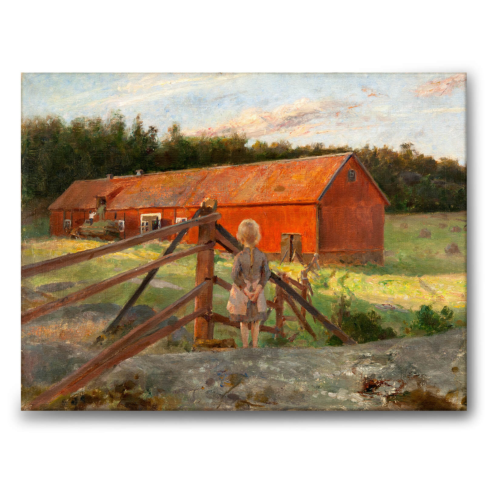 Canvas with a painting from 1887 by the Swedish artist Hanna Hirsch-Pauli. The painting is called The Farm, or Ladugården in Swedish , and is painted in oil. In the picture we see a little girl looking out towards the barn where you can see people working.