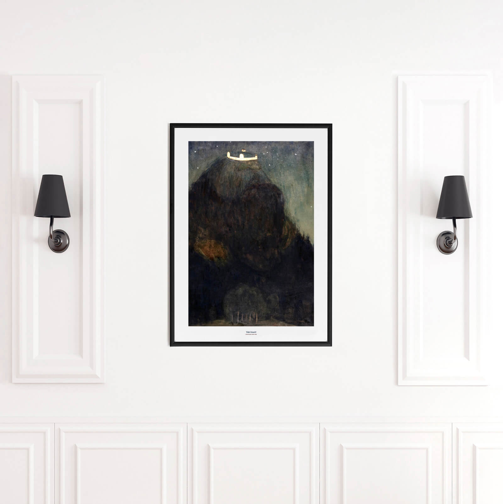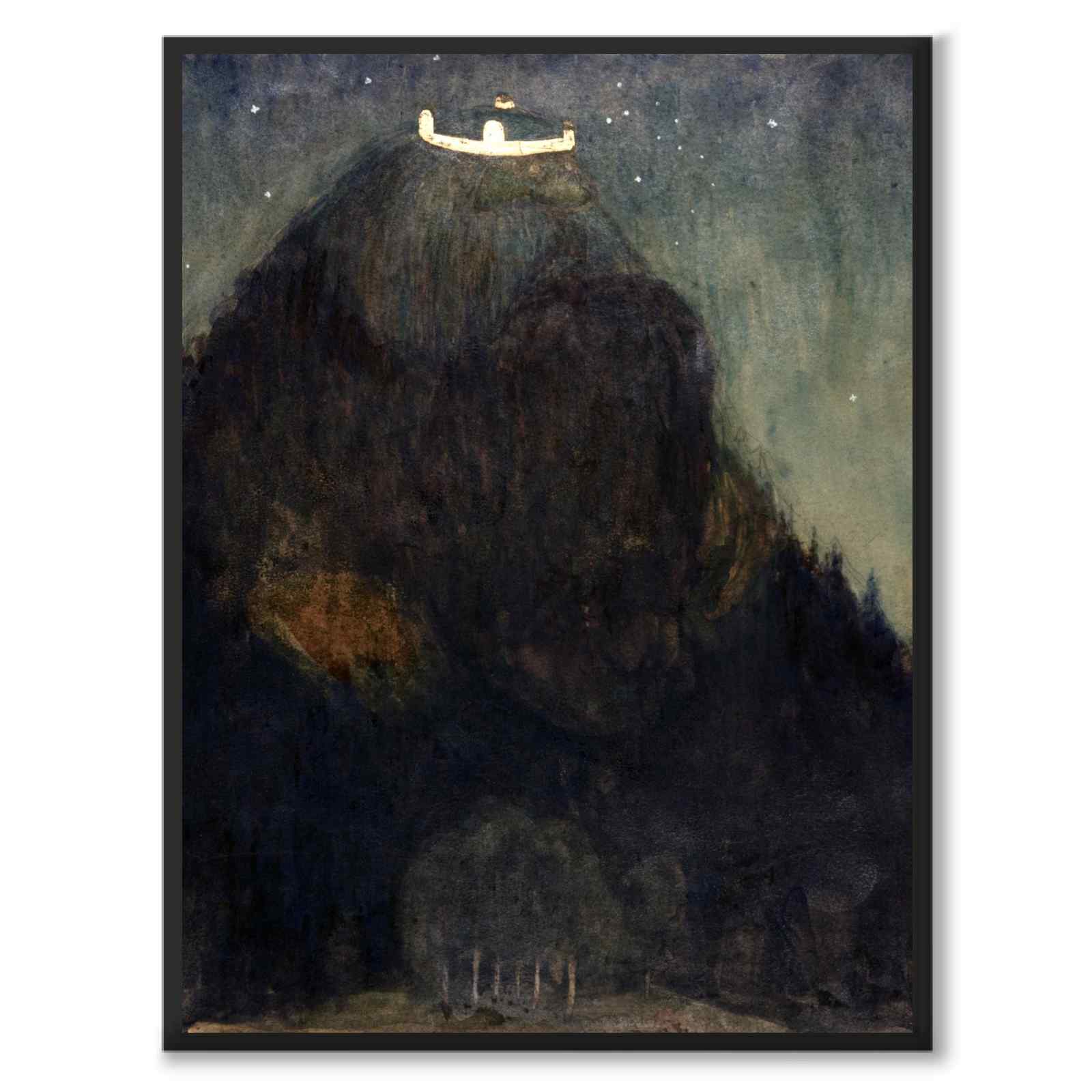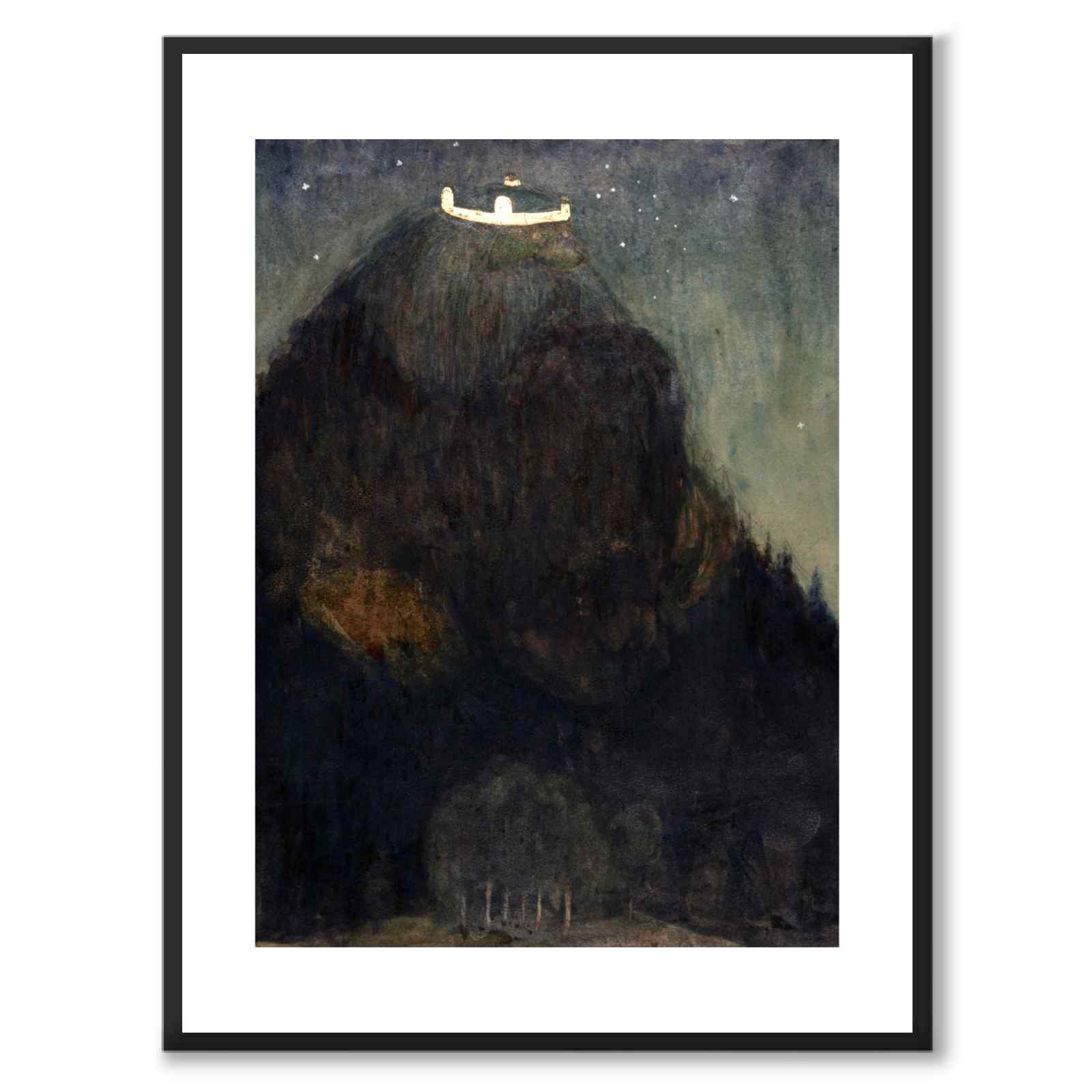 Poster with painting by John Bauer depicting a large troll wearing a king's crown. The huddled and mysterious figure looks like a large and forested mountain.