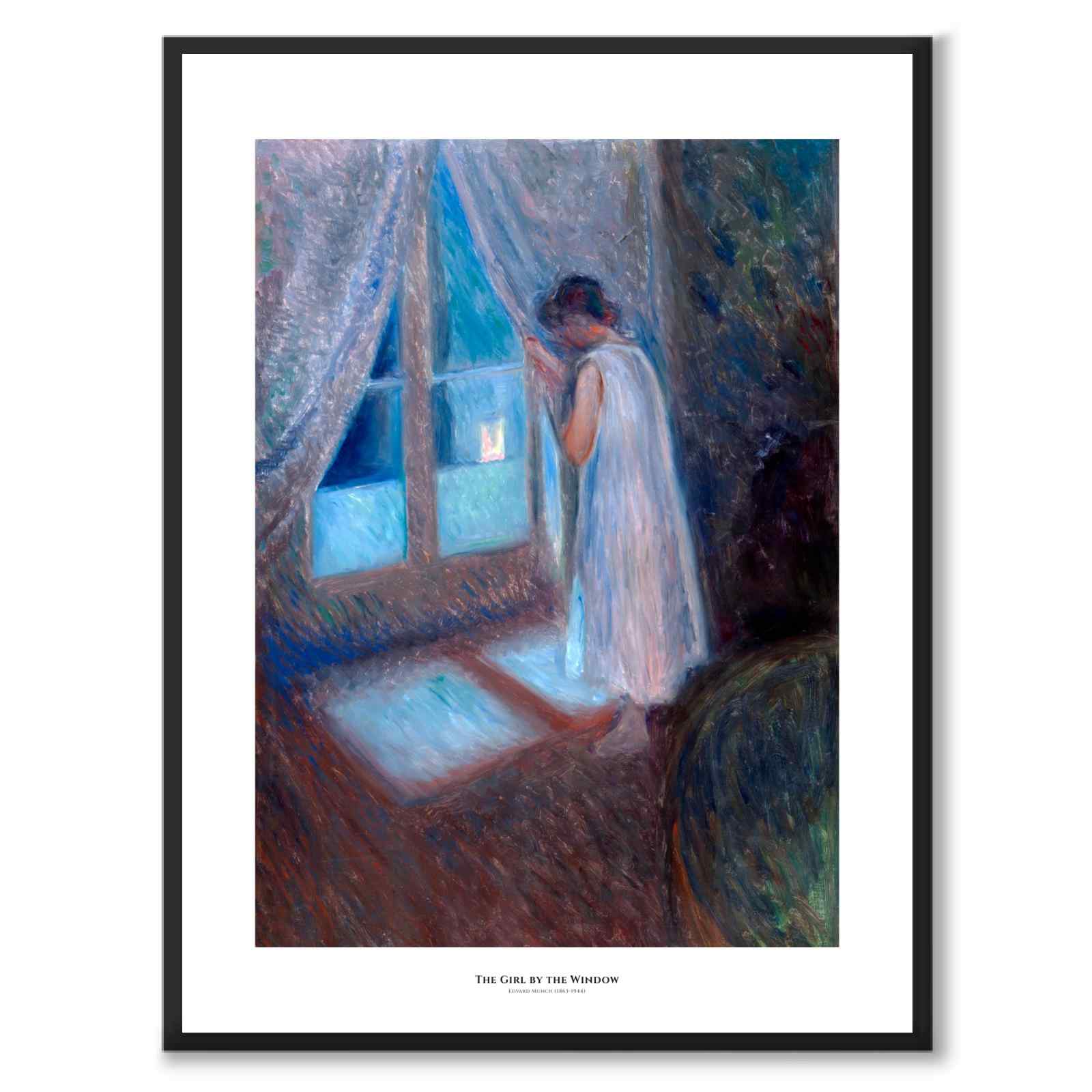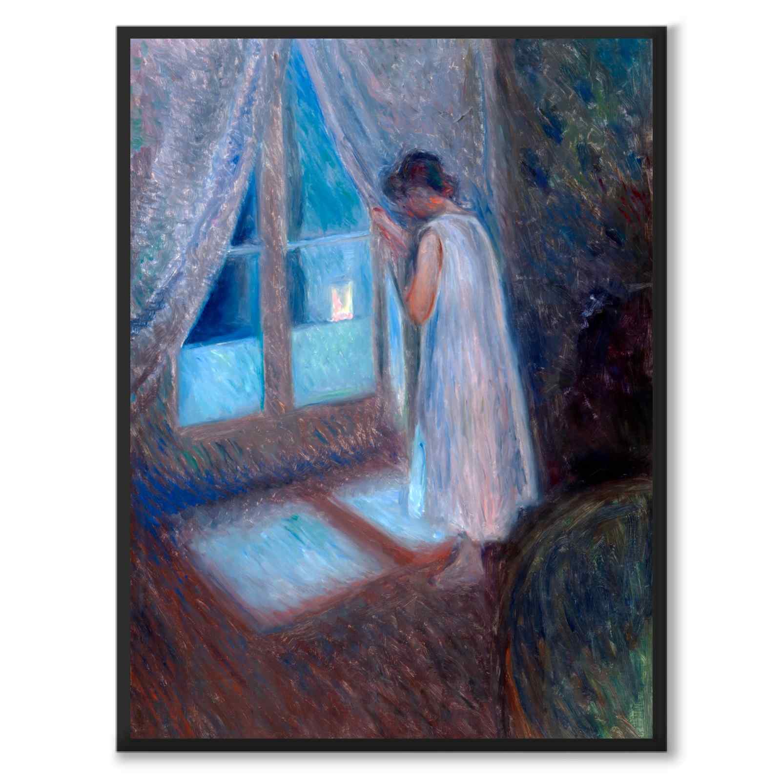 Poster with the painting The Girl by the Window by Edvard Munch. The work was painted in 1893 and shows a woman standing by an open window and looking out over the city in the night light. She is wearing a white nightgown and her hair is in a bun.