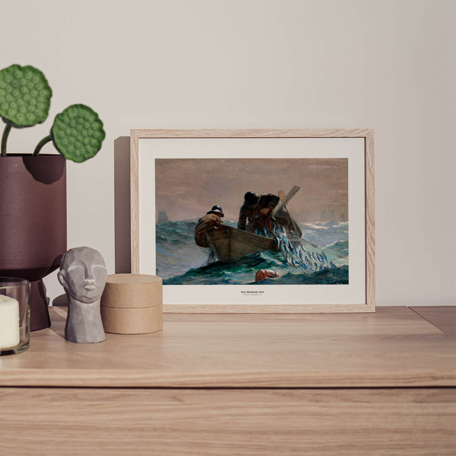 In the early 1880s, Homer moved to a small coastal town in Maine, where he would create a series of paintings never before seen in American art. After visiting a small fishing village in England in 1882, his view of his own life and his painting changed. The paintings he would create after his visit focused almost exclusively on man's struggle against the elements of nature. Homer was fascinated by the fishermen's daily work, fishing for, among other things, herring.