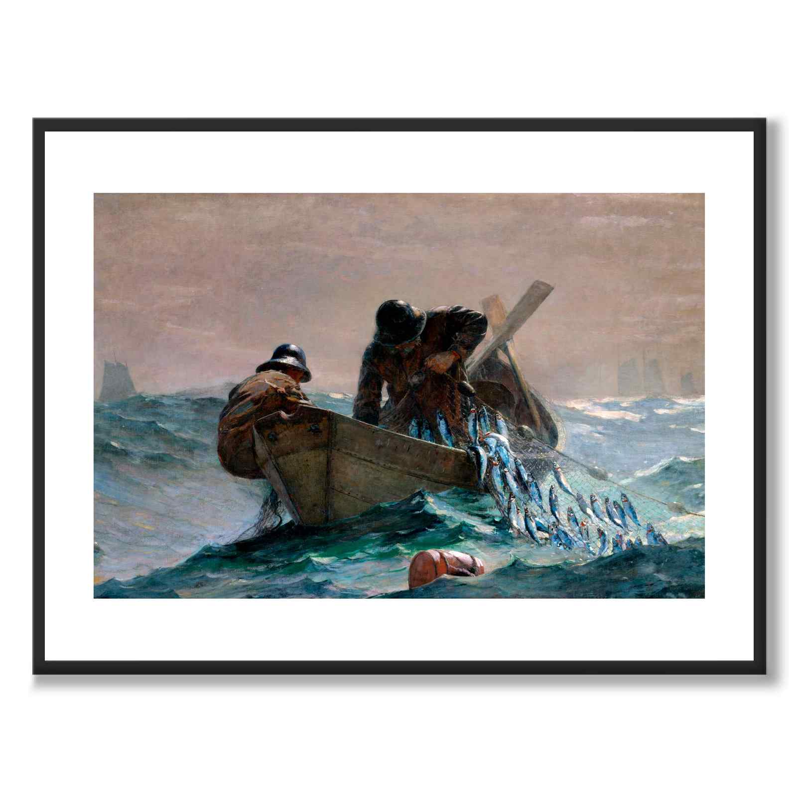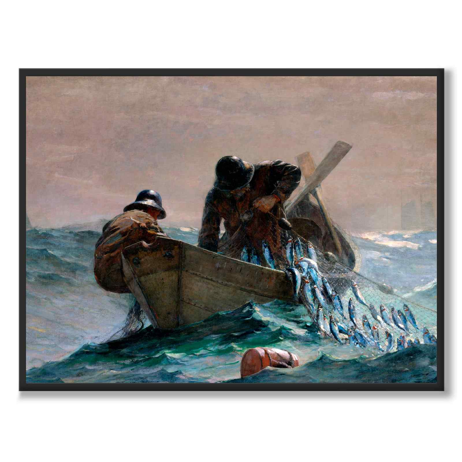 Homer's painting of the two fishermen in the small rowboat shows the cooperation required to successfully raise the heavy nets and bring in the catch back to the larger ships seen in the background.