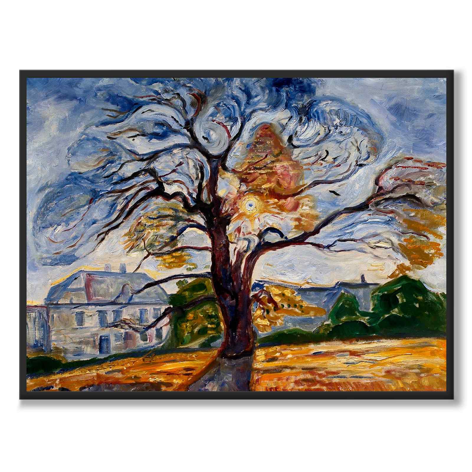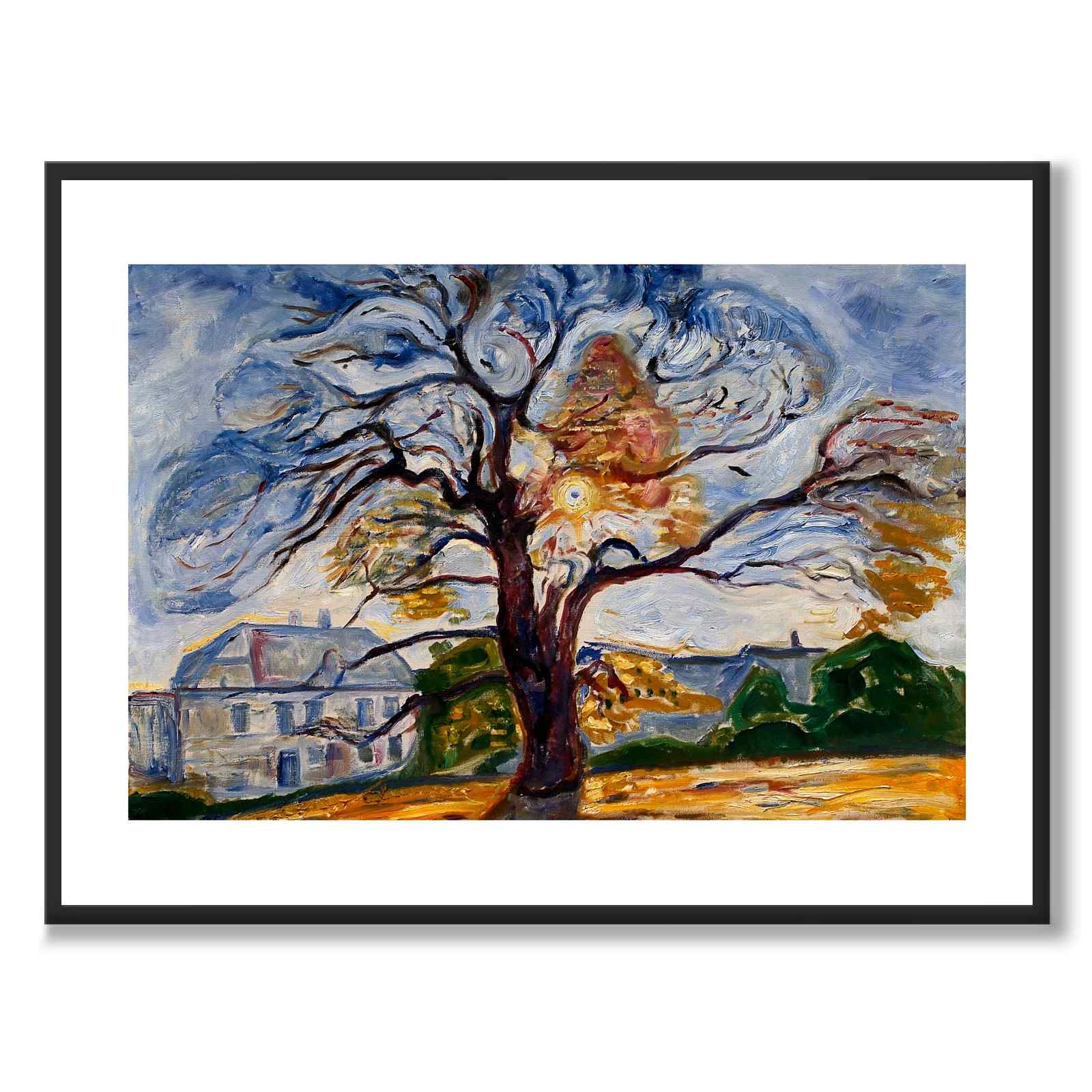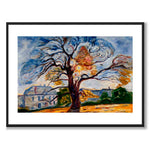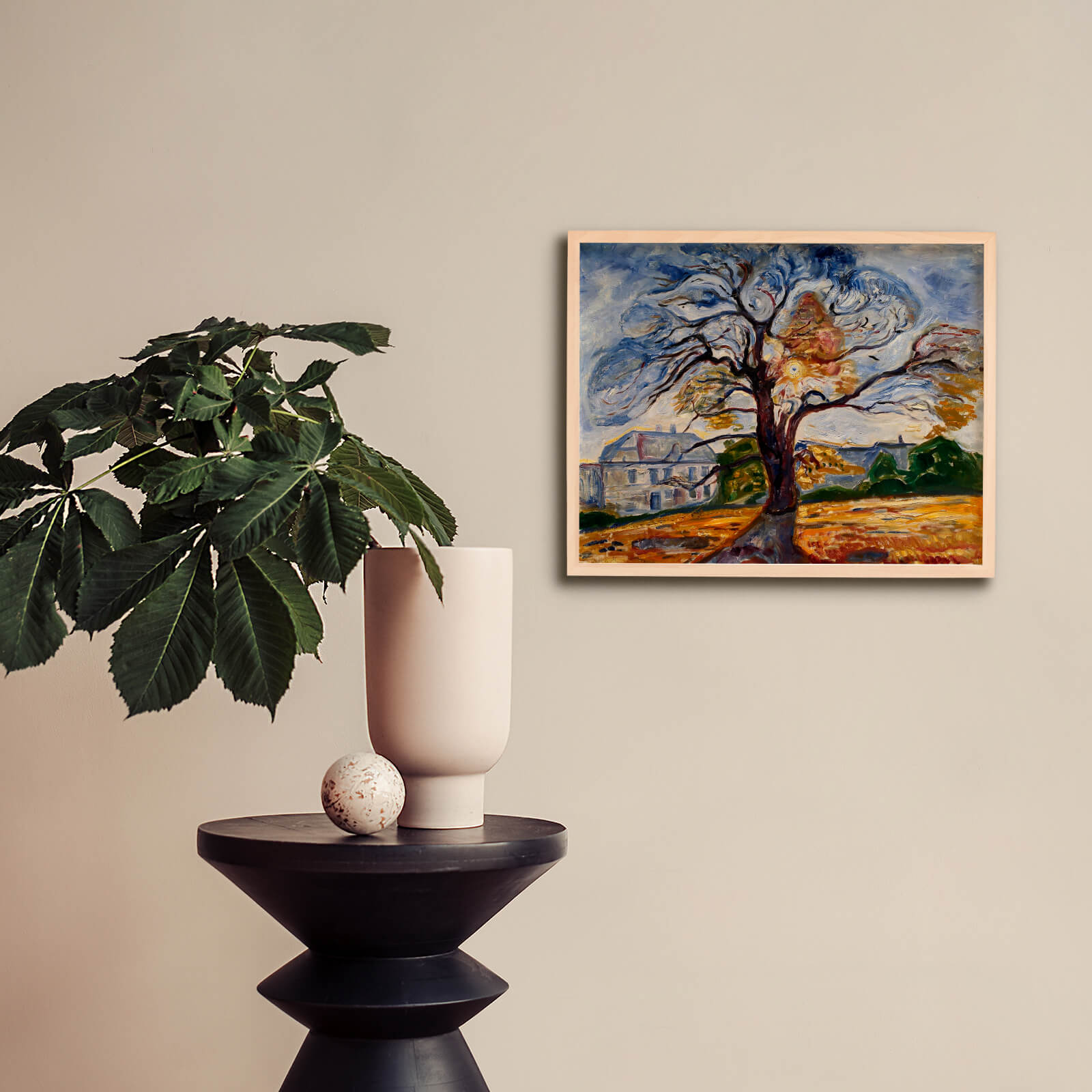 Poster with the painting The Oak by Edvard Munch. The work depicts a stately oak in front of a sun. The grass and the few leaves the tree has left are yellow, indicating that it is autumn if not a prolonged summer drought.