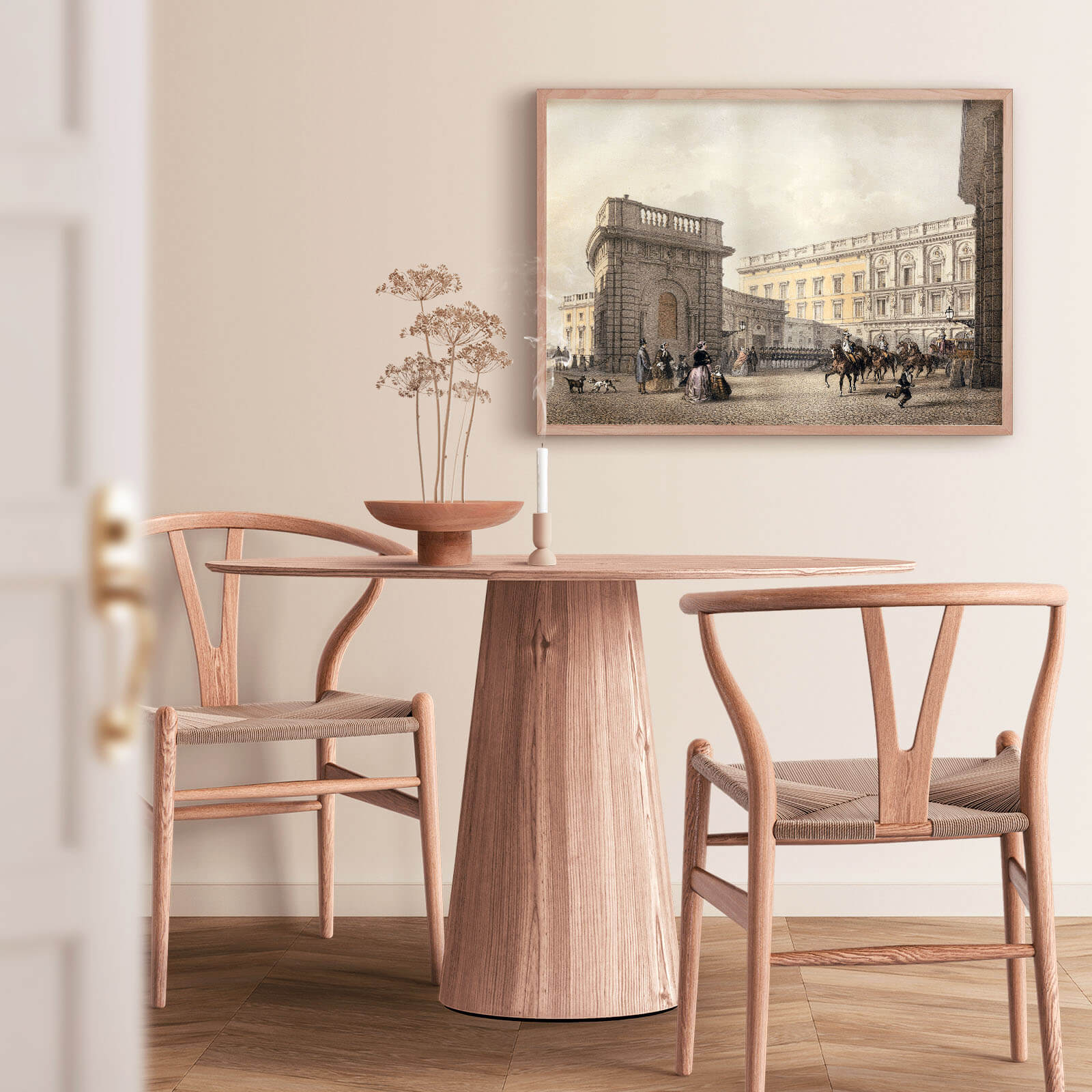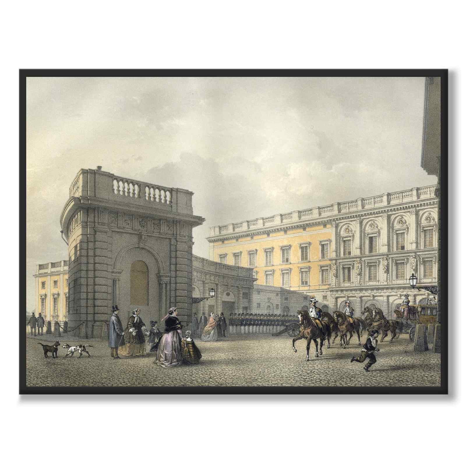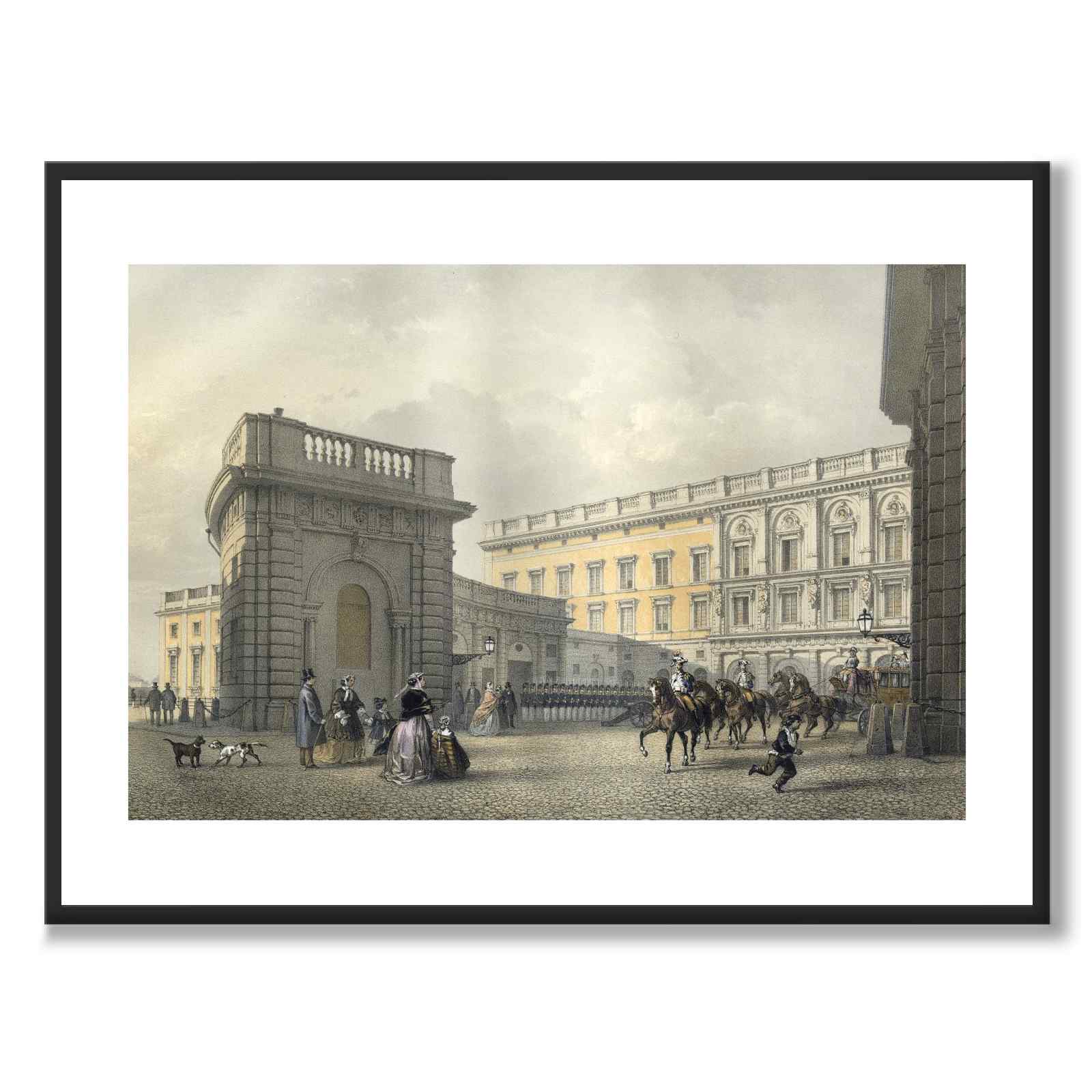 Poster with a painting depicting the outer courtyard of the Royal Palace in Stockholm. The artwork is painted by the well-known artist Carl Johan Billmark, who was a prominent landscape artist in the 19th century.