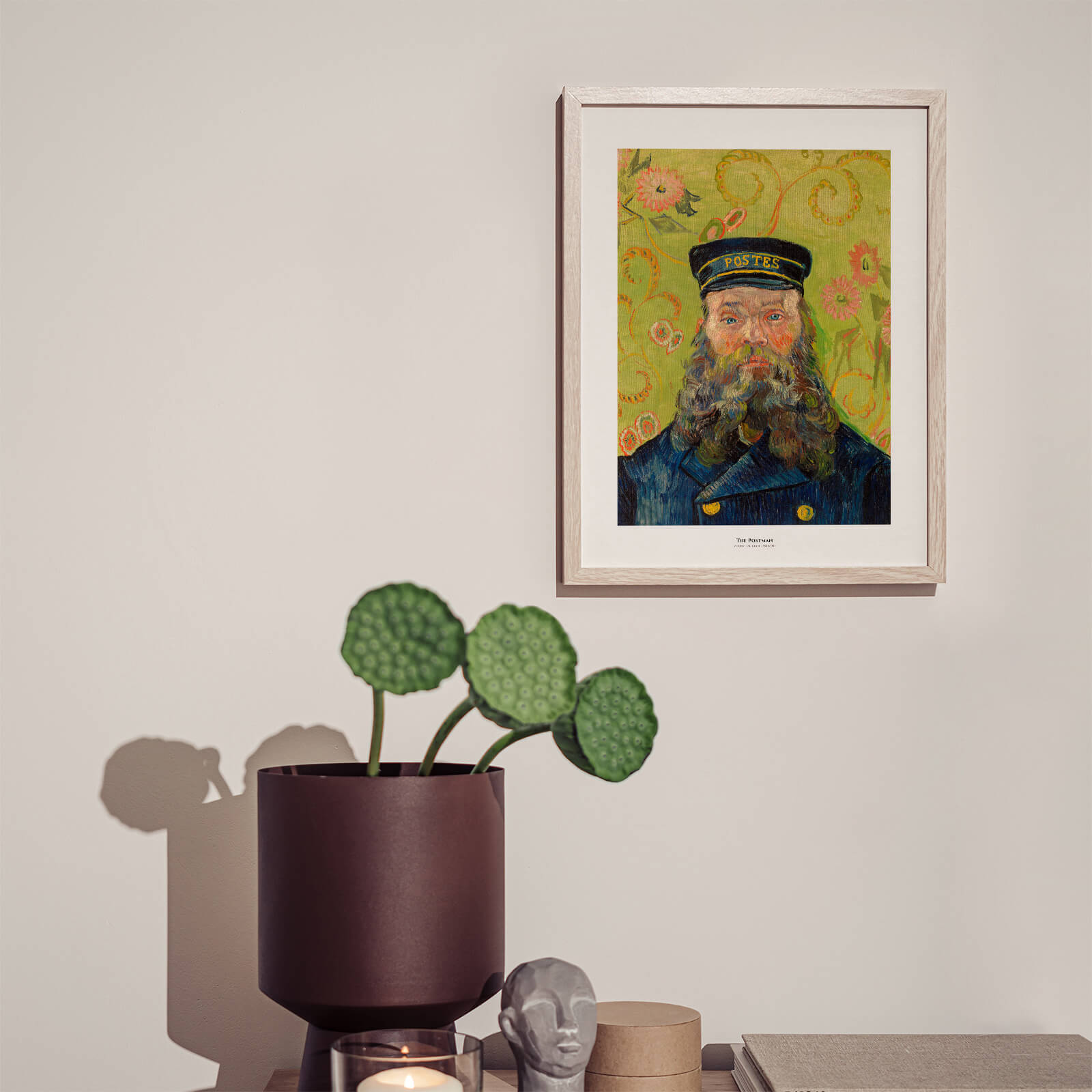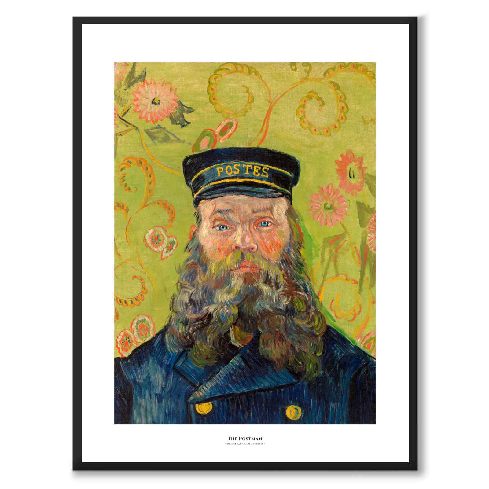 Poster with the motif The Postman from 1889 by the impressionist artist Vincent van Gogh. Van Gogh probably met the postman Joseph Étienne-Roulin who worked at the Arles train station in the south of France, when he rented a room above a café in the city.