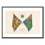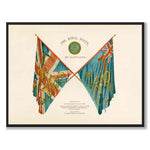 The flag on the left is the British Union Jack, while the flag on the right is the regiment's own colours, often containing details symbolizing the unit's achievements and glory in battle.Frame not included.