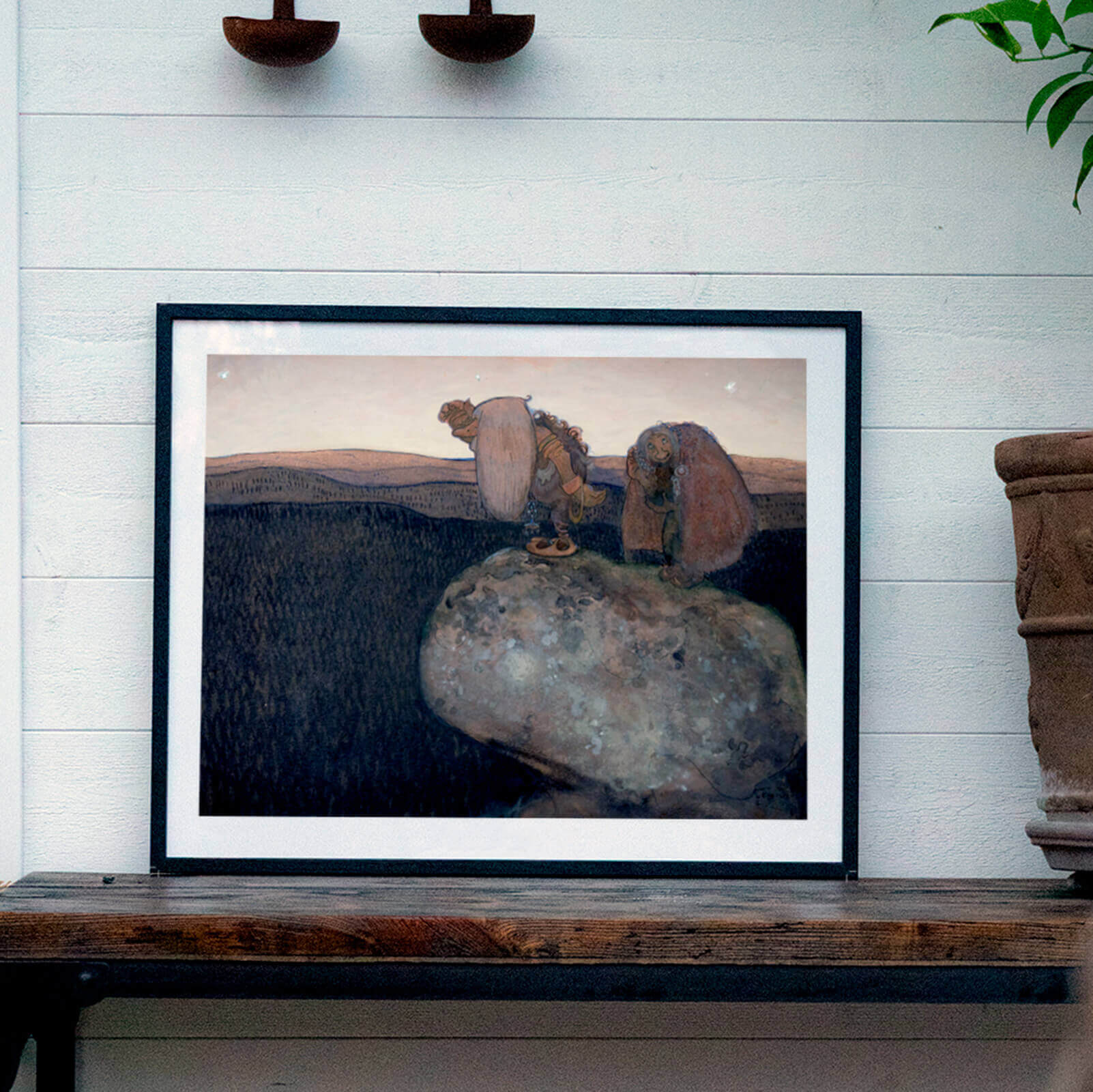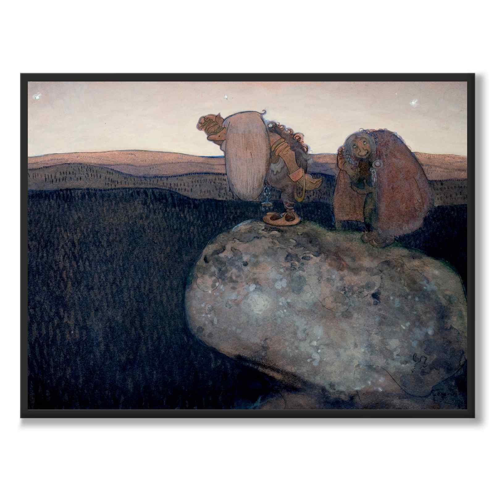 Poster with the painting Trollen i Domberget Stranger Wait by John Bauer from around 1907. The motif shows two trolls looking out over a vast forest landscape at dusk. They listen carefully for sounds from the forest. Who are they looking for? John Bauer is known for his fairy tale motifs with trolls and princesses and he has had a great influence on Swedish folklore and storytelling.