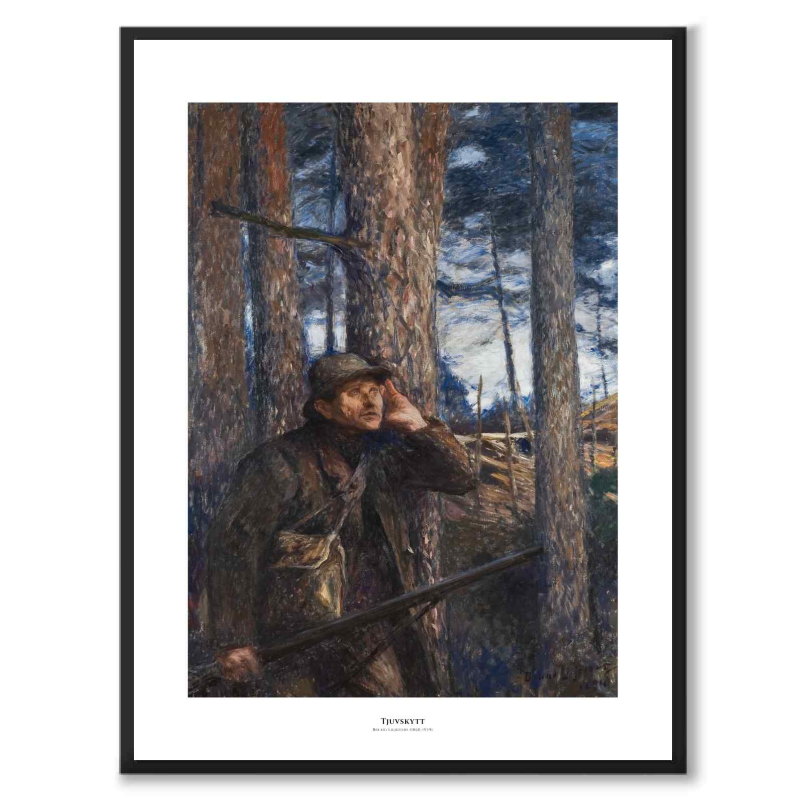This poster shows Bruno Liljefors' famous painting Sniper from the year 1887, a work that is considered one of his most outstanding. The man in the picture holds a rifle and listens intently for sounds in the forest.