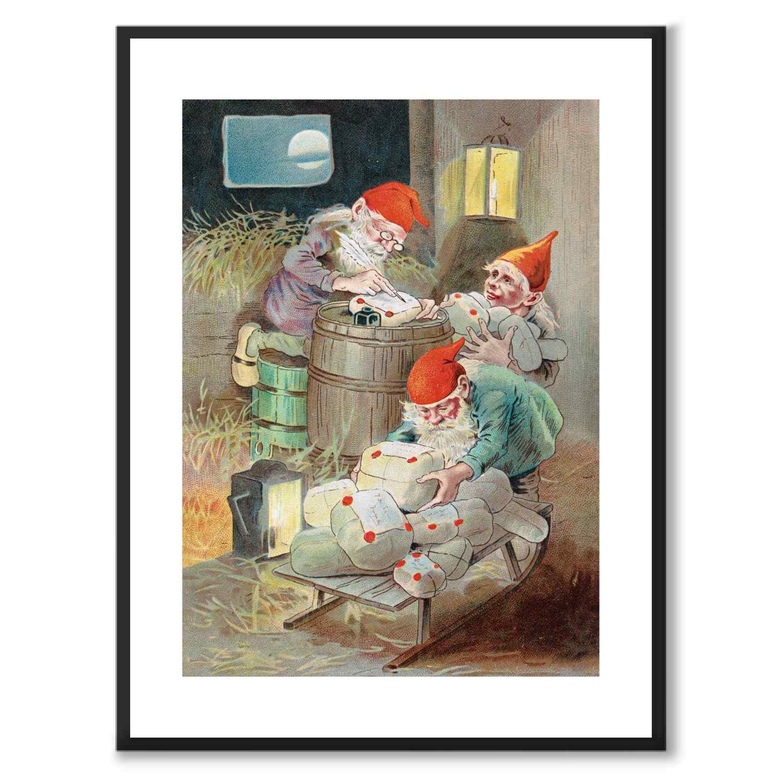 Poster with a classic Christmas motif by Jenny Nyström from 1899. Three elves make some Christmas presents in a barn and load them onto a sleigh.
