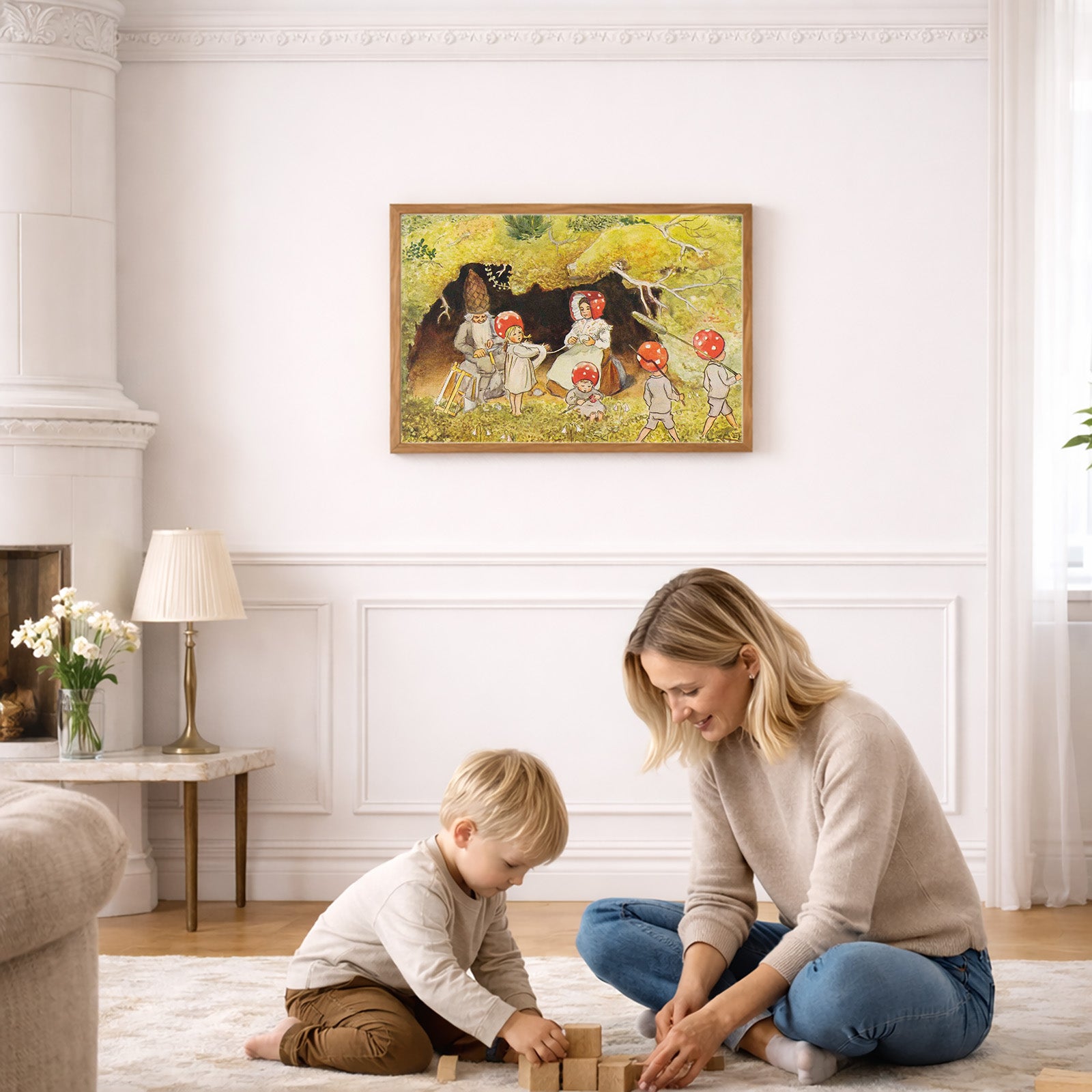 Santa's children is one of Elsa's most famous books and was published in 1910. The book tells the story of a small family of elves who live in a stump in the forest. Through beautiful illustrations and poetic text, Beskow depicts the adventures of the little elves and their interactions with animals and nature. The book is a tribute to the beauty of nature and has an educational tone that encourages care for the environment.