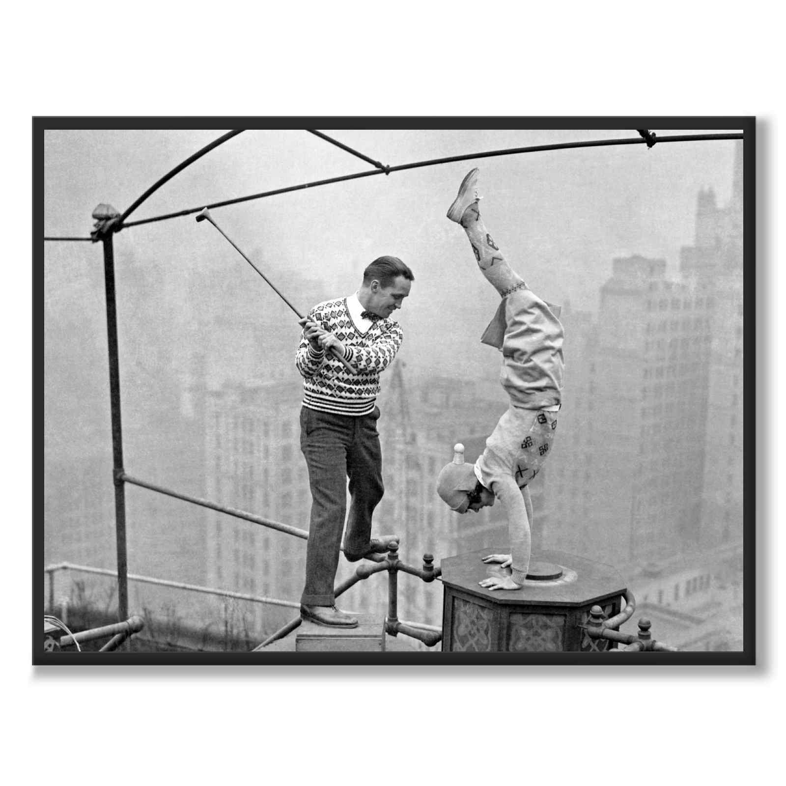 Poster with a funny picture of a golf pro standing high up on a high-rise building and about to tee off. The golf ball is balanced on the head by a gymnast standing on her hands right at the edge.