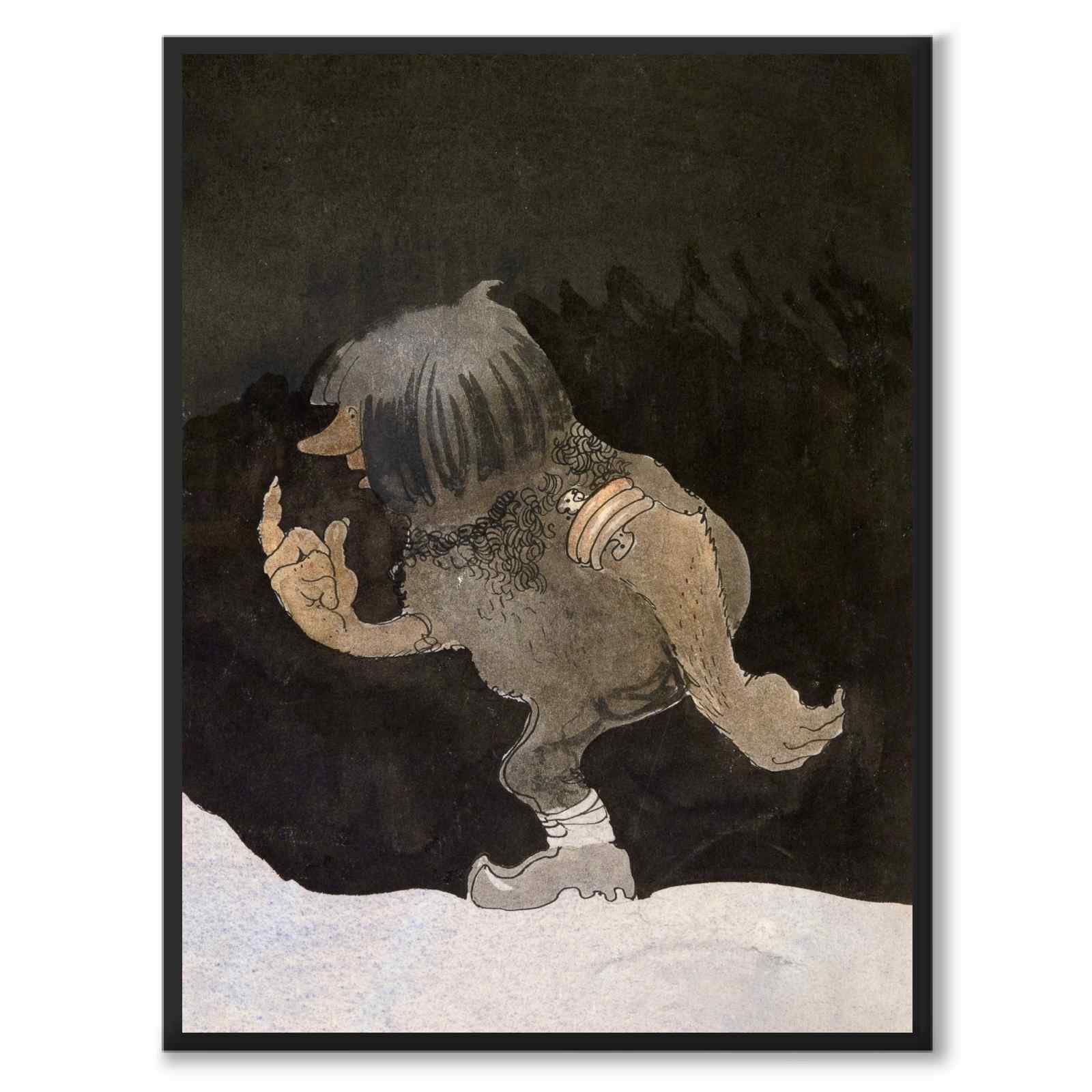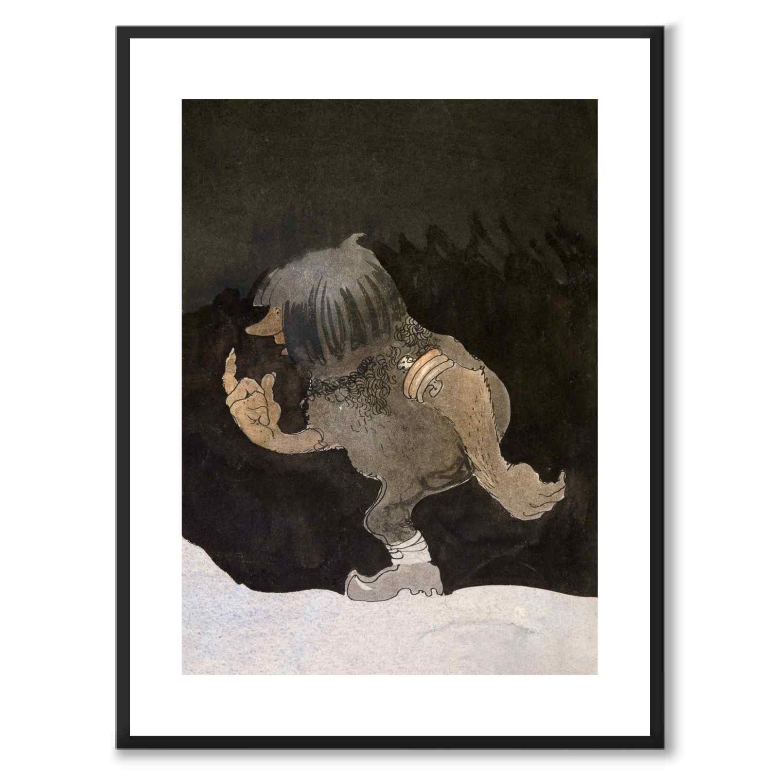 Poster with the painting Troll on a walk by John Bauer. In the picture we see a troll standing in a dark and snow-covered winter landscape. Behind him the deep spruce forest is spread out.
