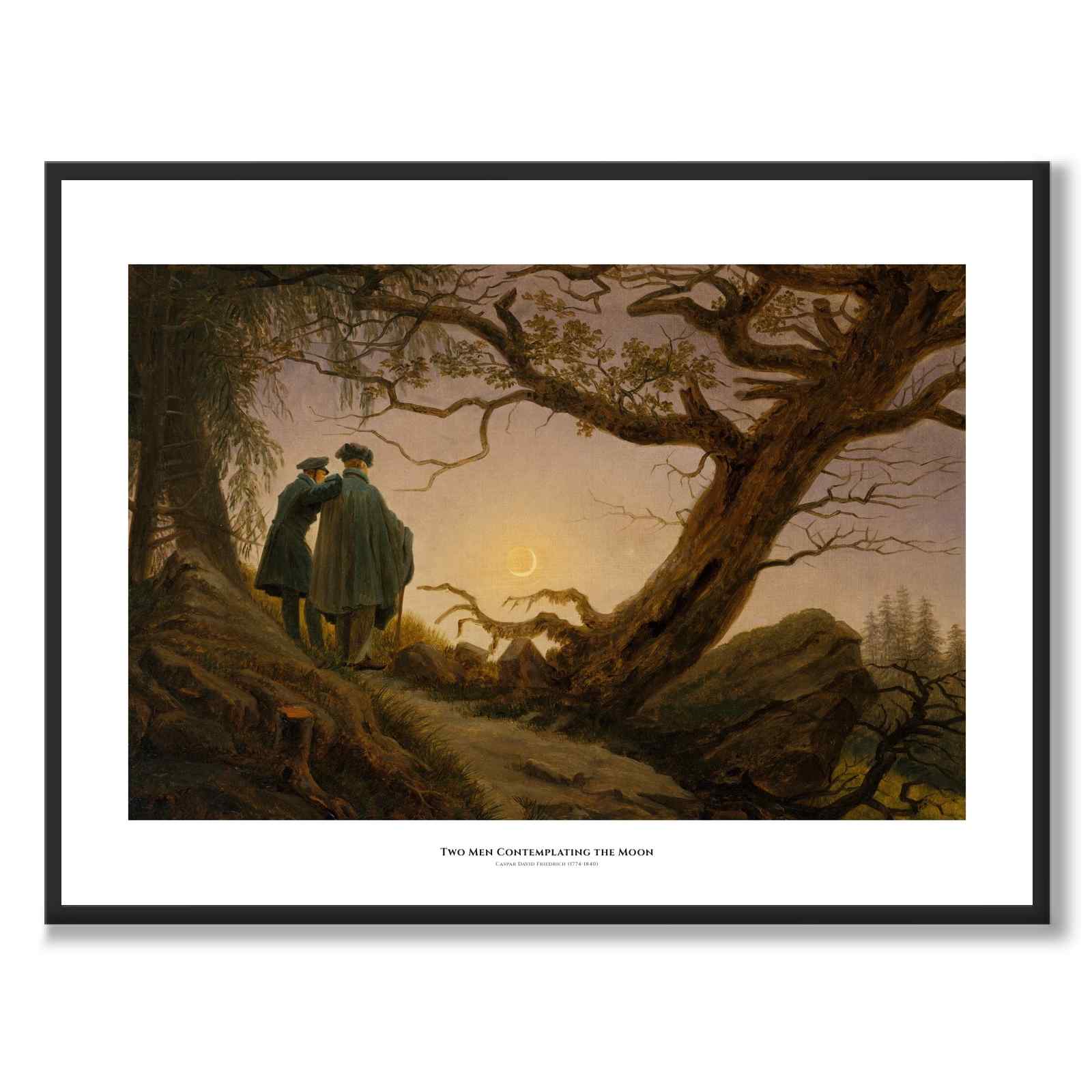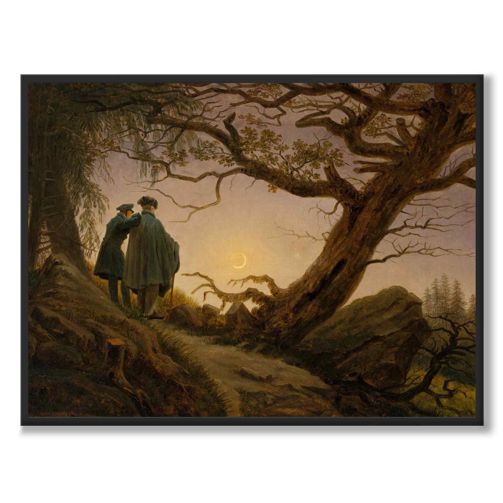 Poster with the beautiful painting Two Men Contemplating the Moon . The painting was created by the German artist Caspar David Friedrich around 1825-30. Friedrich is considered one of the most famous landscape painters of Romanticism.