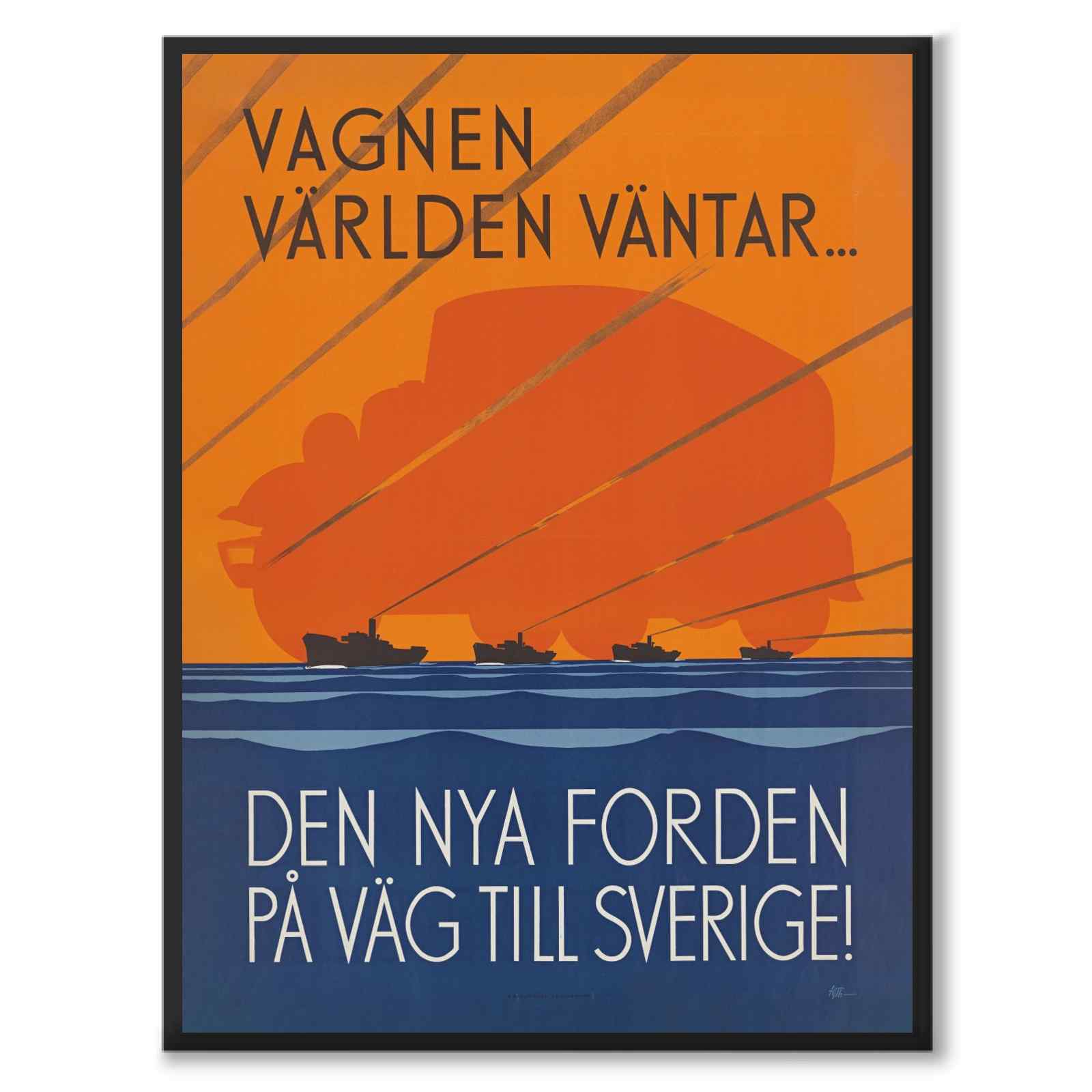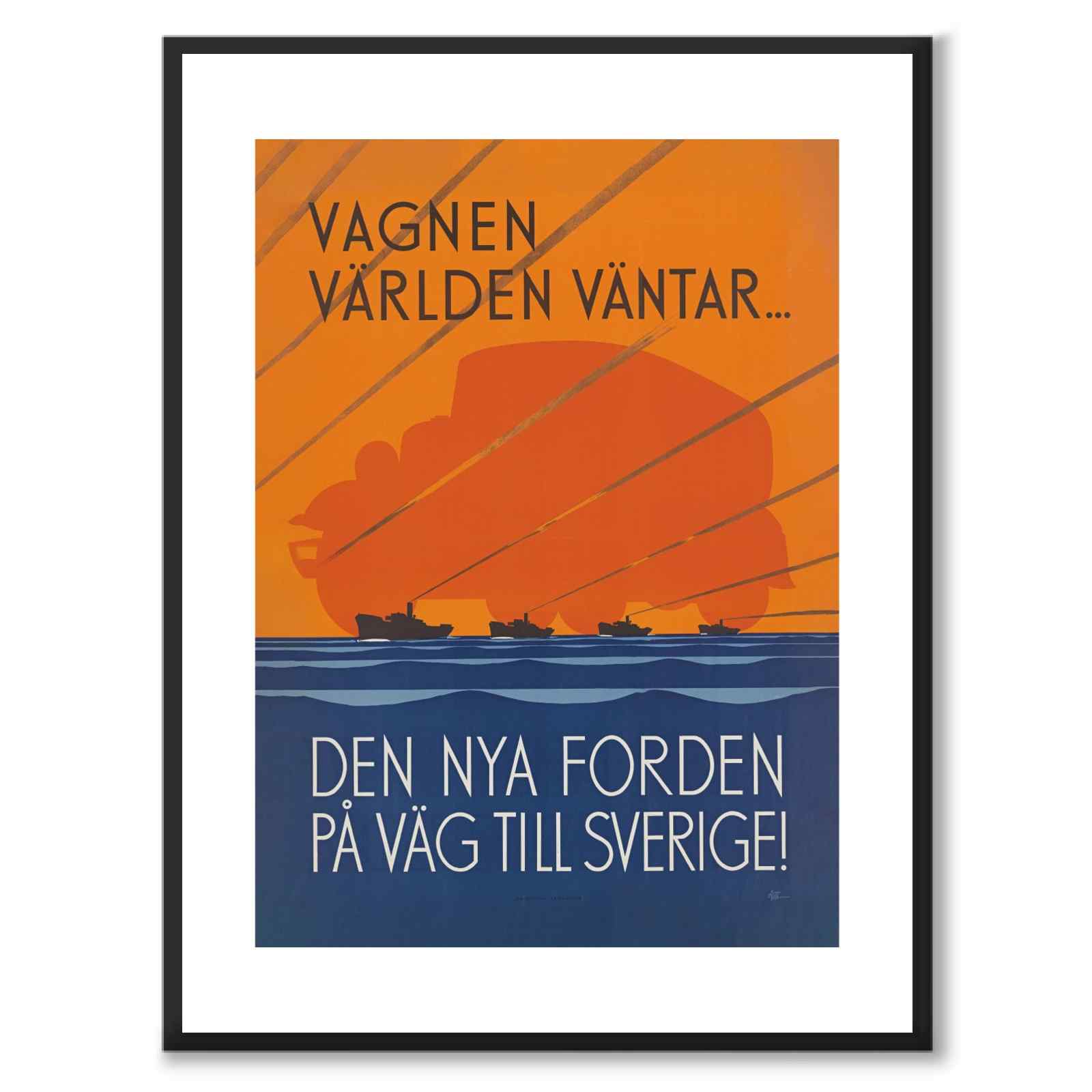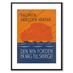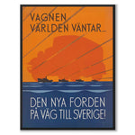 Poster with a retro illustration created in 1932 by Hjalmar Thoresson. On the picture we see the text: " The wagon the world is waiting...The new Ford on its way to Sweden ". Along with the text, we see the motif of boats on a sea and the silhouette of a large car in the background.