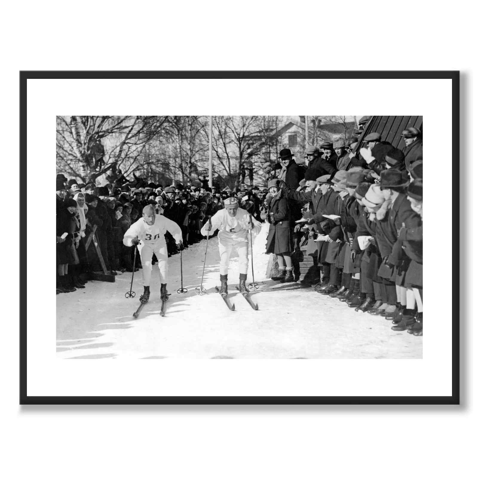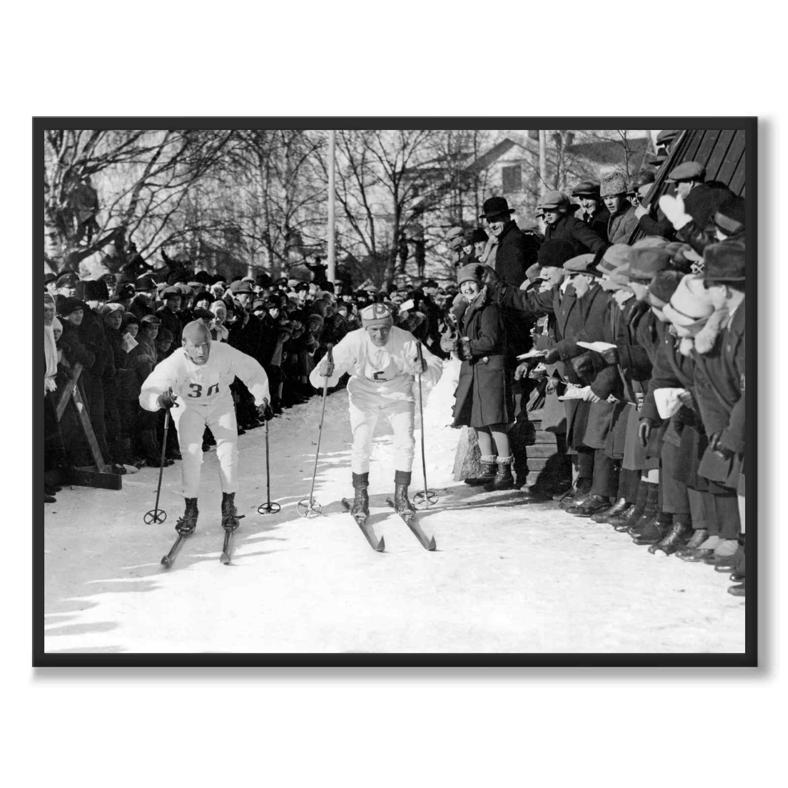 Shared victory in the Vasaloppet on March 11, 1928. In the photo we see Sven Utterström and "Särna" Hedlund riding side by side towards the goal. They cross the finish line in Mora at the same time, much to the dismay of the crown hill.