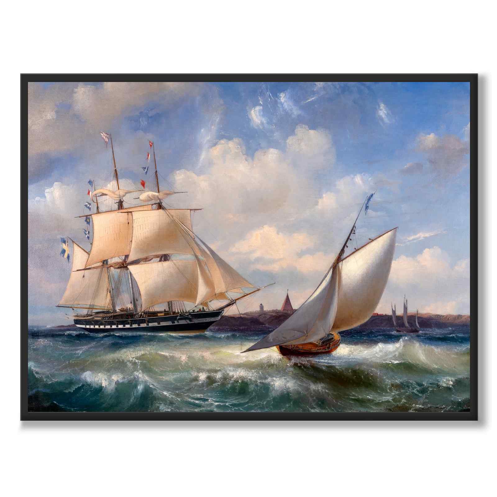 Poster with a beautiful painting painted by the artist Arnold Plagemann in 1856. The grand motif shows ships over a wavy sea and in the background land with the Vinga lighthouse can be seen.