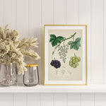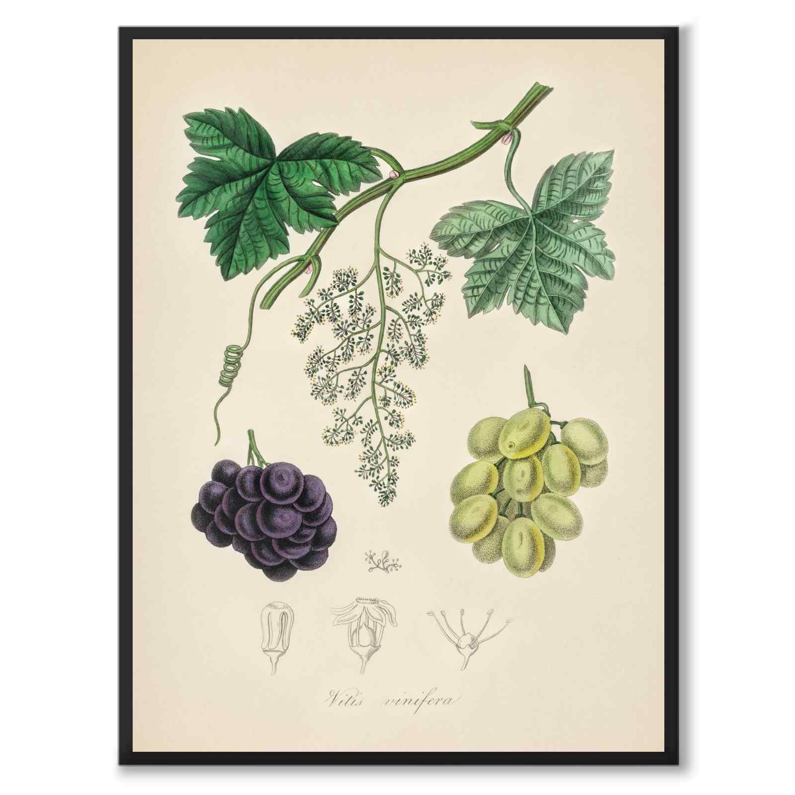 Poster with a classical illustration of grapes and a vine, in Latin Vitis vinifera, from the 19th century.