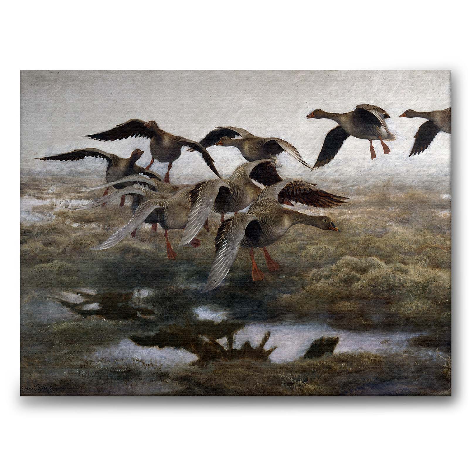 Exclusive canvas painting with a beautiful painting from 1907, painted by Bruno Liljefors. The motif depicts a flock of wild geese landing on a beautiful marsh on a foggy day.