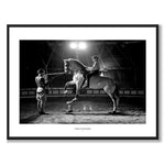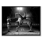 I centrum står en ståtlig häst som lyfter sitt framben i en perfekt balanserad rörelse, medan ryttaren sitter stilla och fokuserad på dess rygg. Mittemot står tränaren, klädd i cirkusuniform, med blicken riktad mot hästen och tyglarna varsamt i handen. Strålkastarljuset från cirkustaket faller ned i en dramatisk kon, och lyser upp både djur och människor på ett sätt som förstärker magin i ögonblicket. Det tomma publikhavet i bakgrunden berättar att detta är en stund av förberedelse, en tyst repetition innan manegens jubel fylls av applåder och musik.