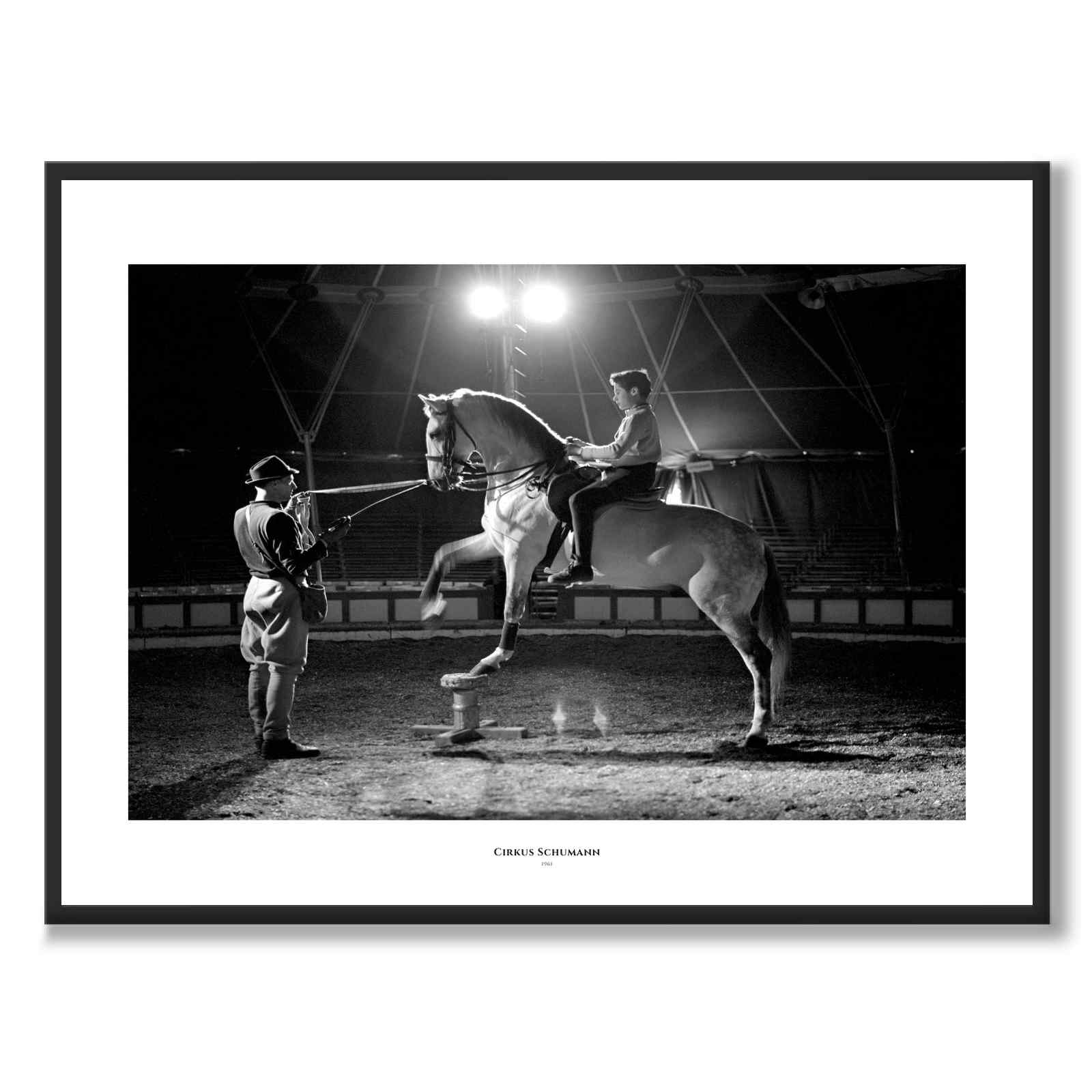 Cirkus Schumann var vid denna tid en av Europas mest prestigefyllda cirkusar, känd för sina eleganta ridnummer och sin skickliga hästskola. Bilden förmedlar den disciplin, närhet och kommunikation som ligger bakom varje föreställning där konsten att samarbeta med ett djur kräver både tillit och precision.