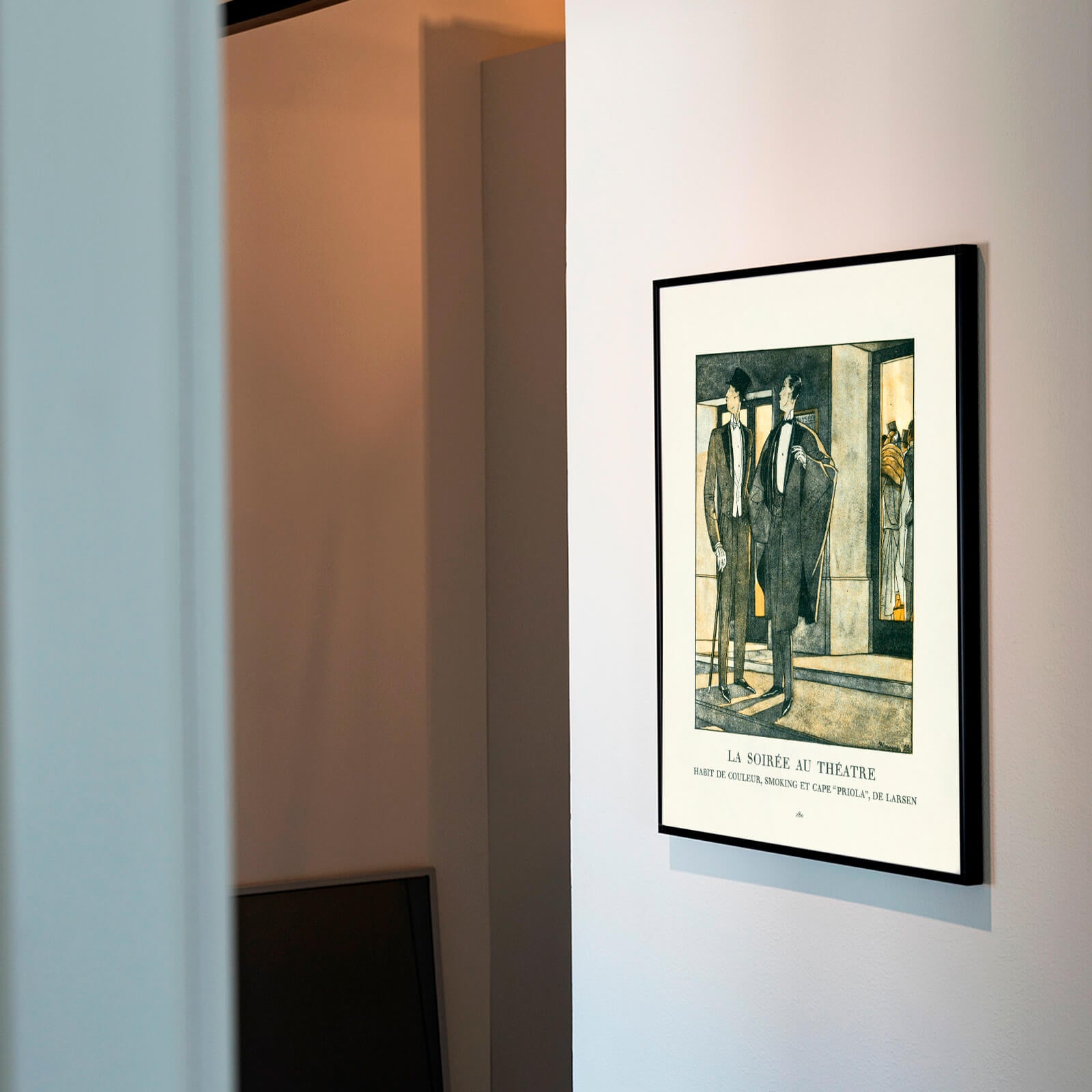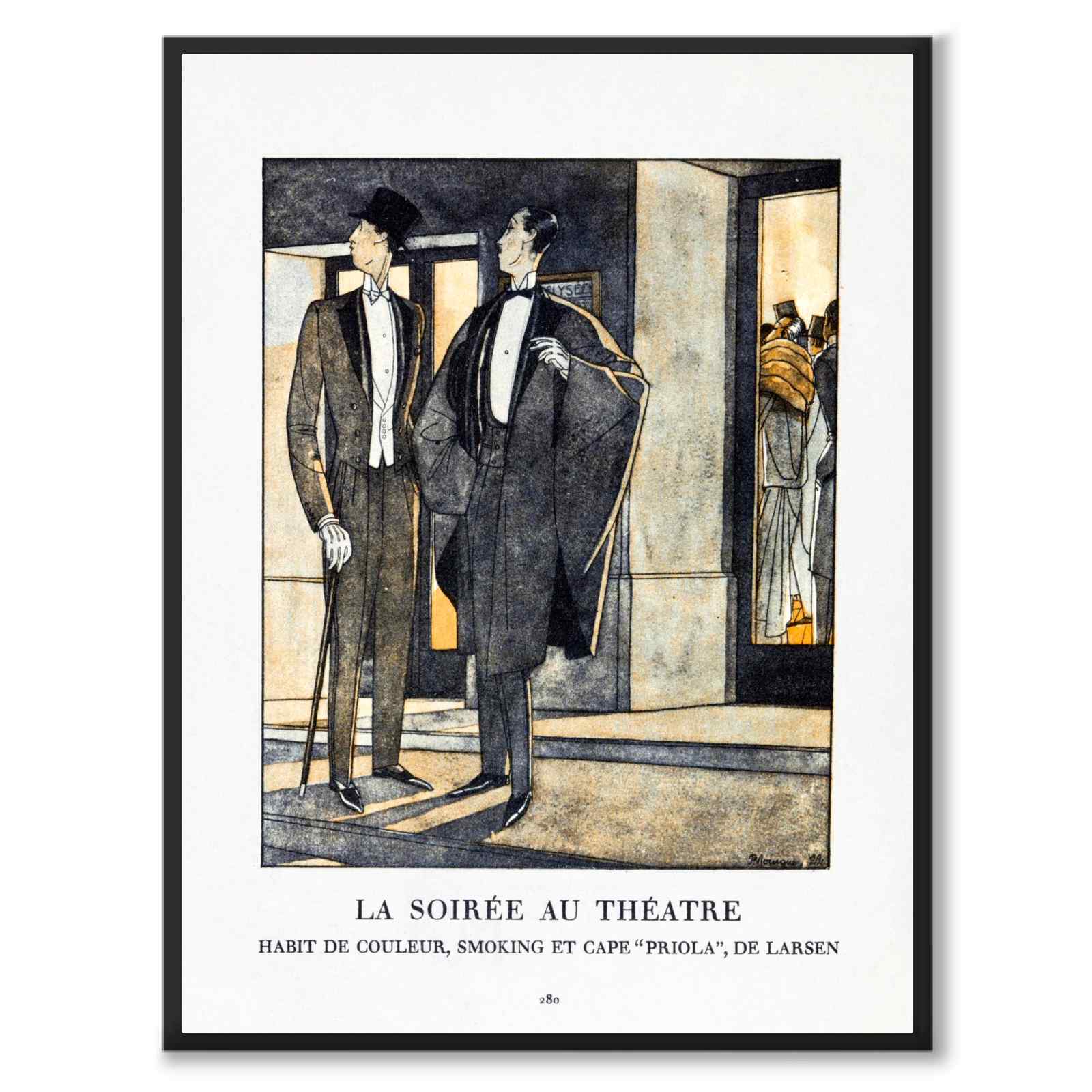Poster med en illustration av två gentlemän utanför en teater en kväll i Paris, Frankrike. Männen bär elegant och exklusiv klädsel inklusive frack, hatt och kappa. Under bilden ser vi texten La Soirée au Theatre, franska för Kvällen på Teatern.