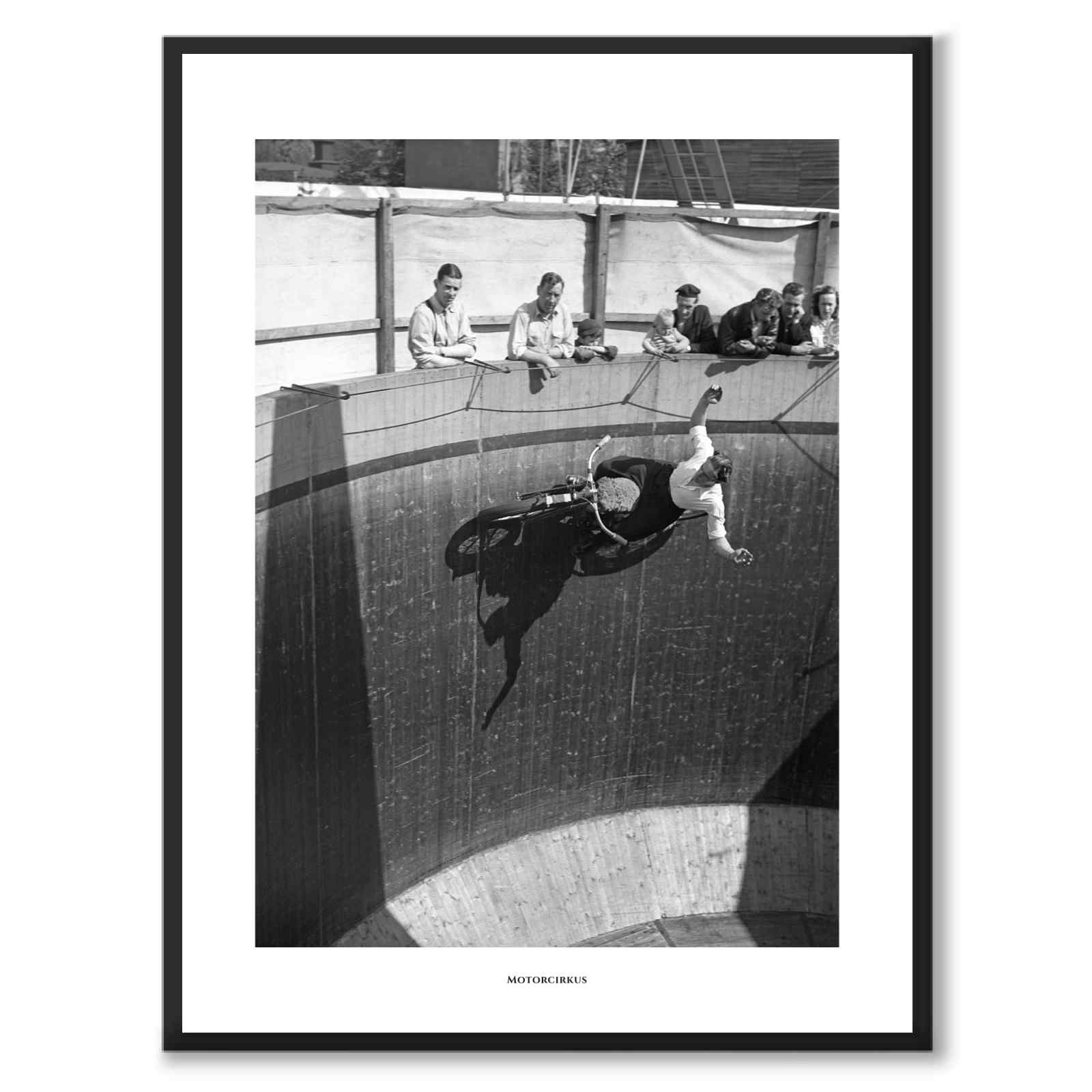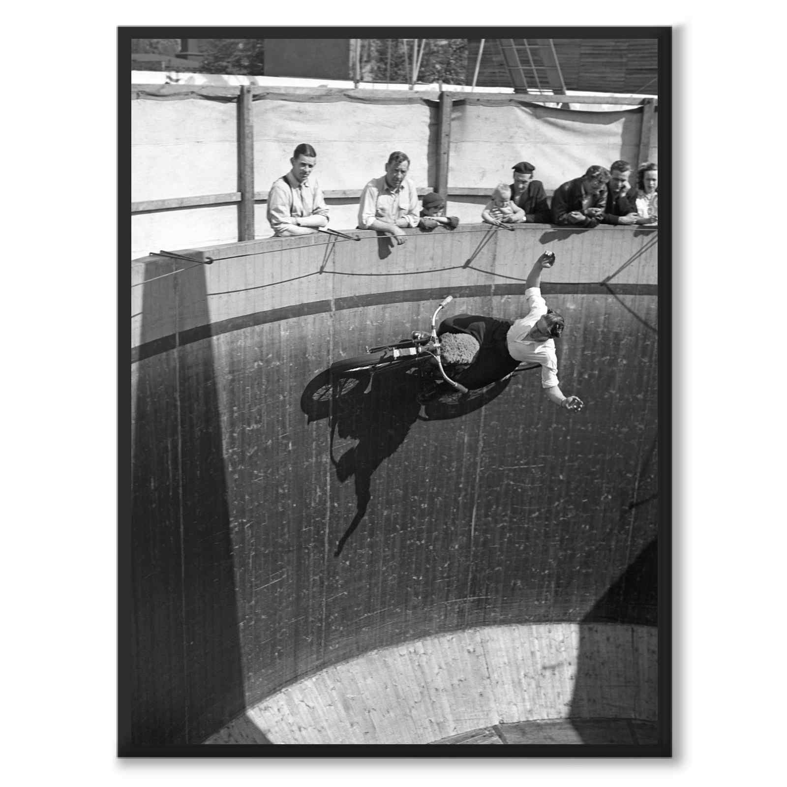 På bilden syns en motorcyklist i hel fram längs den lodräta väggen i en så kallad ”dödsvägg”, där föraren lutar nästa dramatiskt ut över motorcykeln mitt i ett djärvt varv. Ovanför rampens kant står en grupp åskådare män, kvinnor och barn samlade över den våghalsiga uppvisningen framför dem. Solen faller mjukt över träväggen och fångar både rörelsen och den starka kontrasten mellan skuggor och ljus.