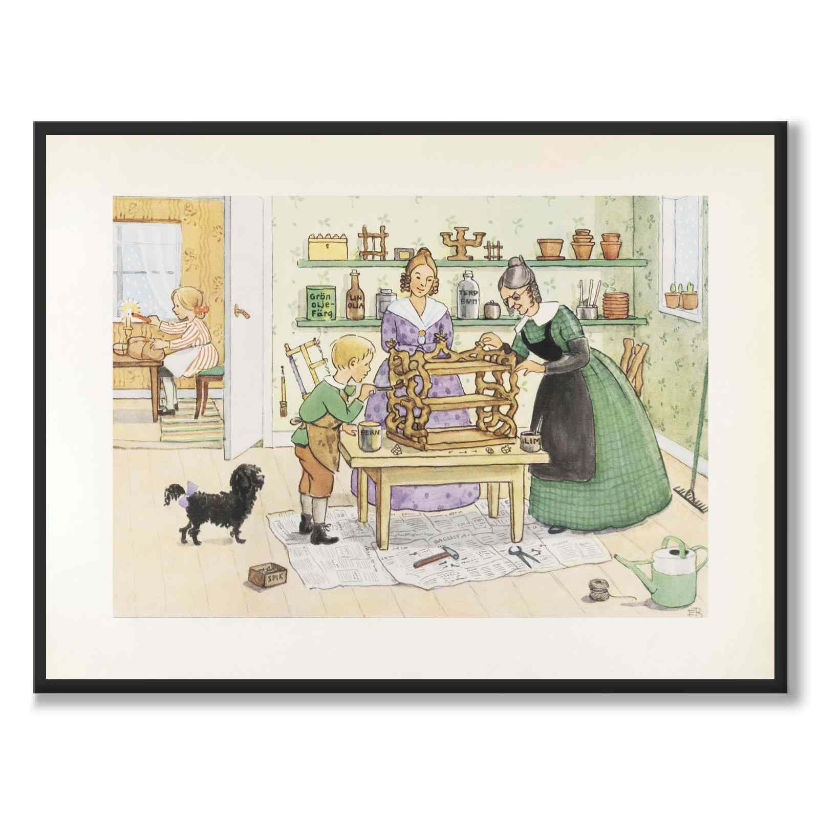 Illustrationen visar en varm och livfull julscen där barn och vuxna arbetar tillsammans i ett hemtrevligt rum. På bordet står ett stort halmarbete som dekoreras omsorgsfullt, medan rummet är fyllt av små detaljer som verktyg, krukor och färgburkar som förstärker den kreativa stämningen. En liten hund står nyfiket bredvid och bidrar till den lekfulla atmosfären som präglar motivet.