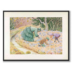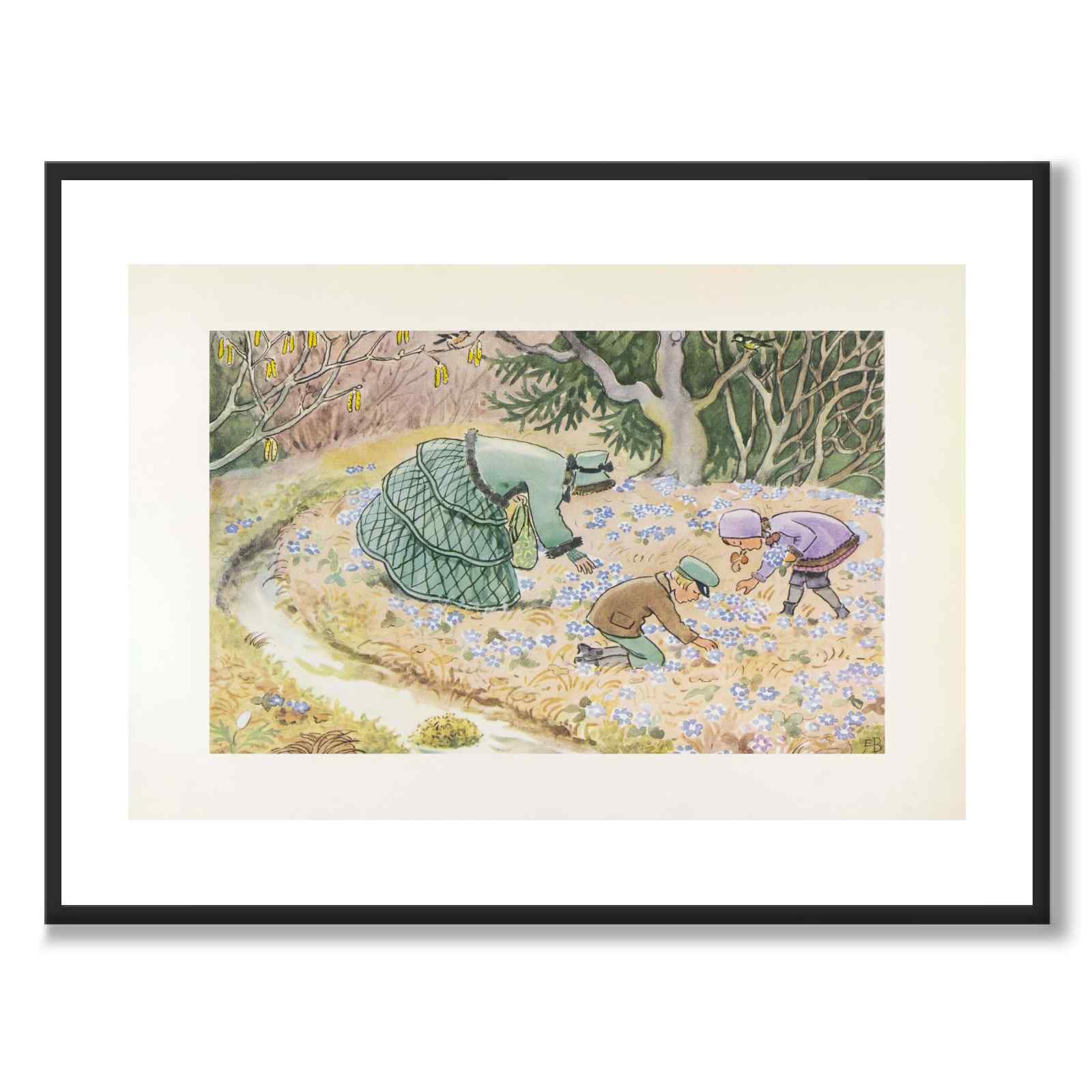 Illustrationen visar en stillsam dag i skogen där två barn och en vuxen person plockar blommor tillsammans. De rör sig genom ett mjukt böljande landskap fyllt av blåsippor, medan trädens späda grenar och en liten bäck i förgrunden skapar en lugn och harmonisk stämning. Motivet fångar både naturens skönhet och den gemenskap som uppstår i enkla vardagsstunder utomhus.