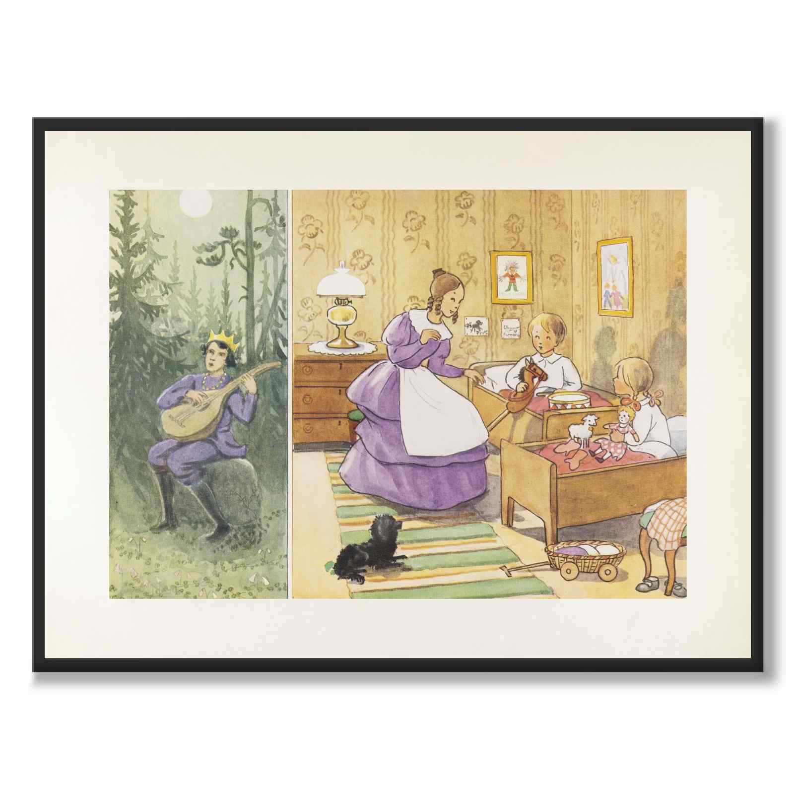 Illustrationen är uppdelad i två delar. Till vänster syns en sagolik scen där en figur sitter i skogsdungen under månskenet och spelar luta, vilket skapar en drömsk och stillsam stämning. Till höger möter vi en varm inomhusscen där en vuxen hjälper barnen att lägga sig, omgivna av leksaker och små figurer på hyllan. Den mjuka belysningen, tapeterna och detaljerna i rummet ger motivet en trygg och rofylld atmosfär.