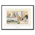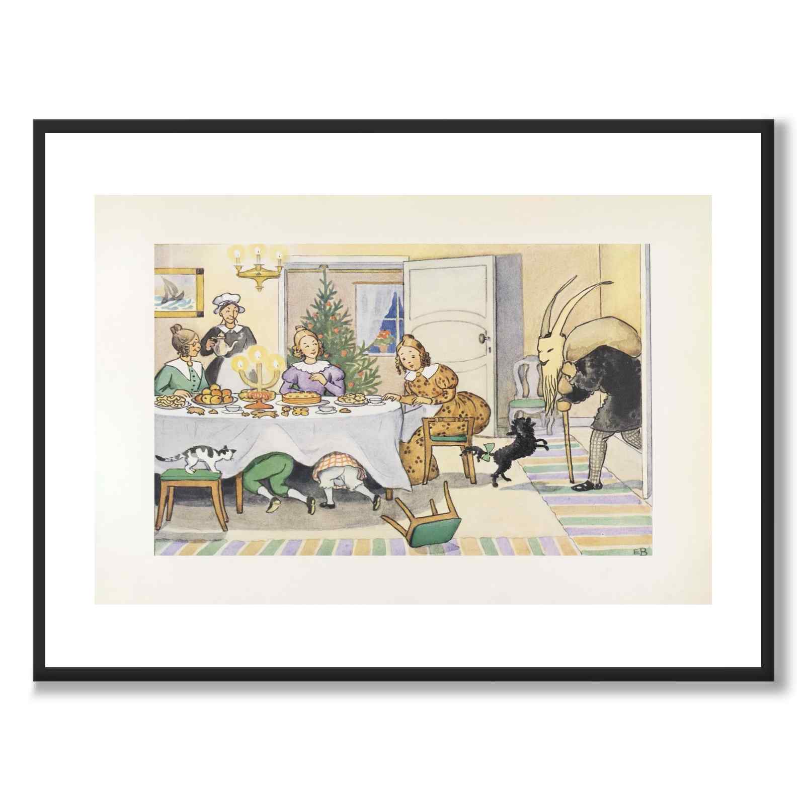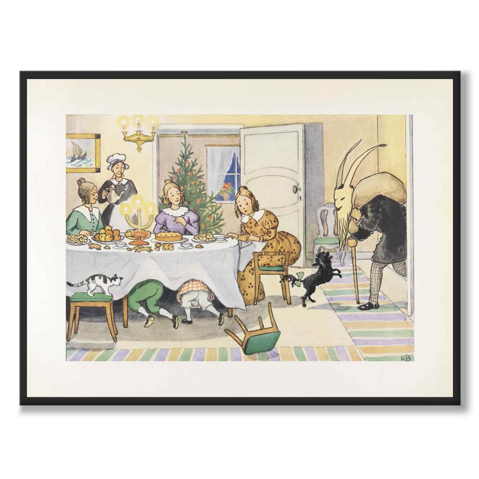 IIllustrationen visar en livlig julscen där familjen sitter samlad runt ett festligt dukat bord fyllt med kakor, bröd och julens bakverk. Mitt i den glada stämningen kryper barnen nyfiket under bordet medan katten smyger efter. Samtidigt stiger en traditionellt klädd julfigur in genom dörren, vilket får hunden att skälla ivrigt och skapar ett lekfullt och oväntat ögonblick.