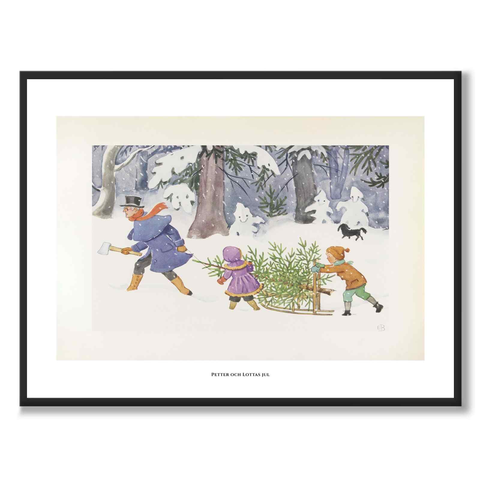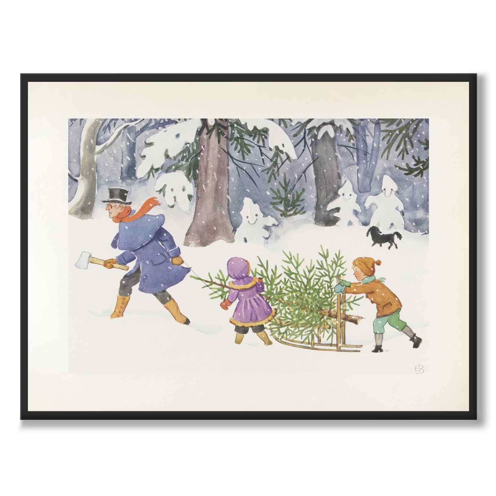Illustrationen visar en vinterdag där en man går före i snön med en yxa i handen medan två barn drar och skjuter på en nyhuggen julgran på en liten kälke. Snön faller tätt mellan de stora träden och skapar en stillsam, nästan sagolik stämning. I bakgrunden syns en liten hund som springer genom den djupa snön och förstärker känslan av rörelse och lek mitt i vinterlandskapet.