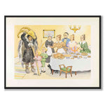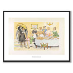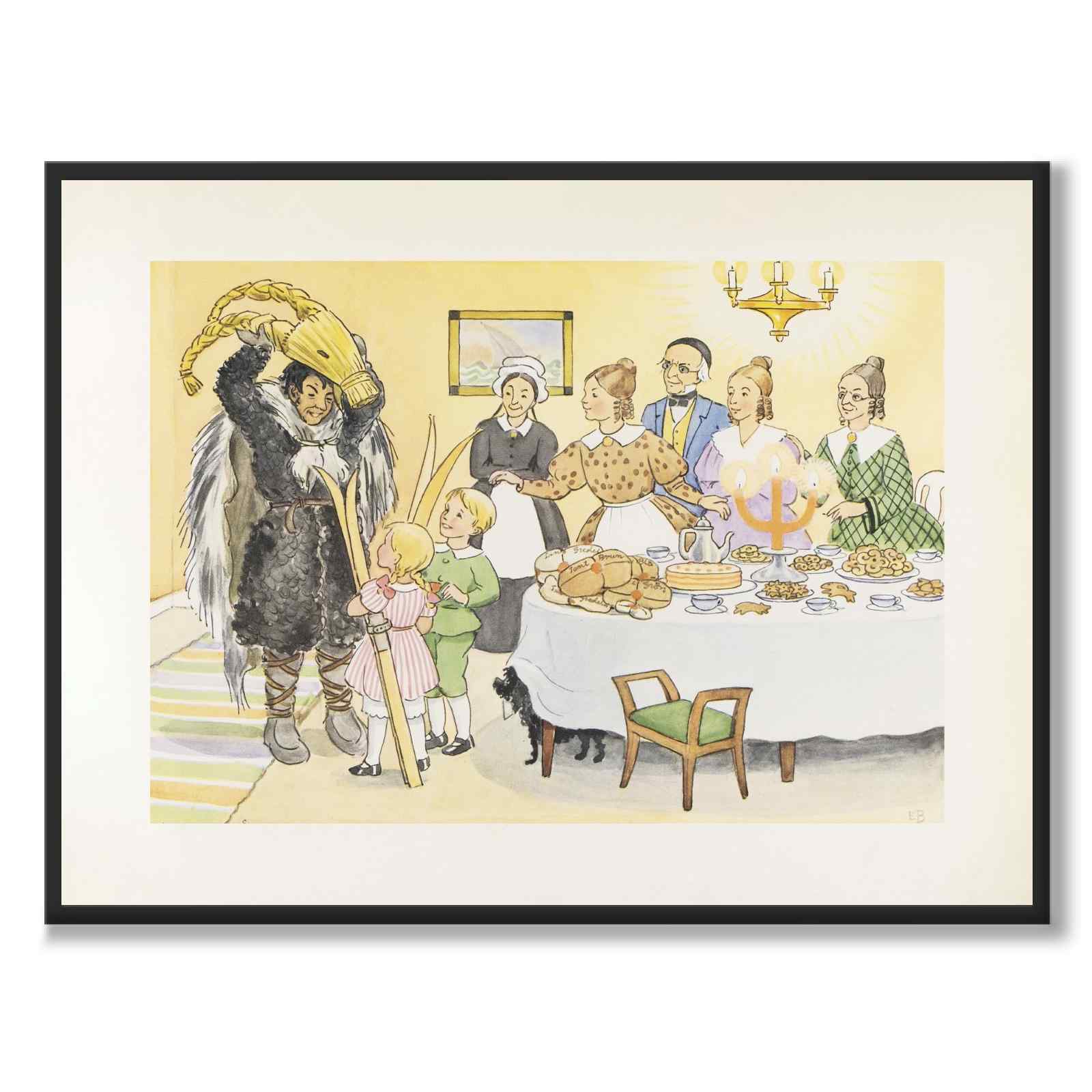 Illustrationen visar en stämningsfull julscen där familj och gäster samlas runt ett dukat bord fyllt med bröd, kakor och julens bakverk. Två barn står intill den traditionellt klädda figuren med kvastar och pälsdräkt och betraktar honom med både nyfikenhet och förtjusning. Rummet är varmt upplyst och fyllt av detaljer som förstärker den festliga atmosfären från julgransljus till omsorgsfullt dukade koppar och fat.