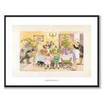 Illustrationen visar en varm och livlig julscen där familjen har samlats runt det dukade bordet, fyllt med kakor, frukt och tända ljus. Två barn står framför bordet och följer nyfiket julens masker och lek, medan två traditionellt klädda figurer med halmmasker och pälsdräkter närmar sig från varsin sida. I bakgrunden lyser julgranen från den öppna dörren och skapar en stämning av fest, tradition och förväntan.